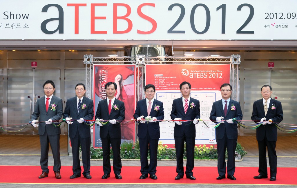 Vice Minister for Industry and Technology Yoon Sang-Jick (fourth from left) cuts the ribbon at the opening of the aTEBS 2012, or the Asia Top Electronics Brand Show on September 25 in Seoul. date2012-10-09