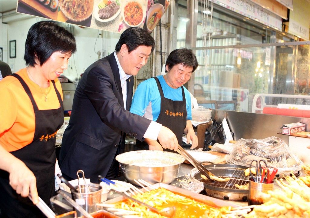 Minister of Knowledge Economy Choi Kyunghwan lends a hand with cooking at a traditional market in Seoul on September 7. The Minister visited the market in the run-up to the Chuseok holiday to assess the cost of holiday items and find out what difficulties merchants may be experiencing. date2010-09-08