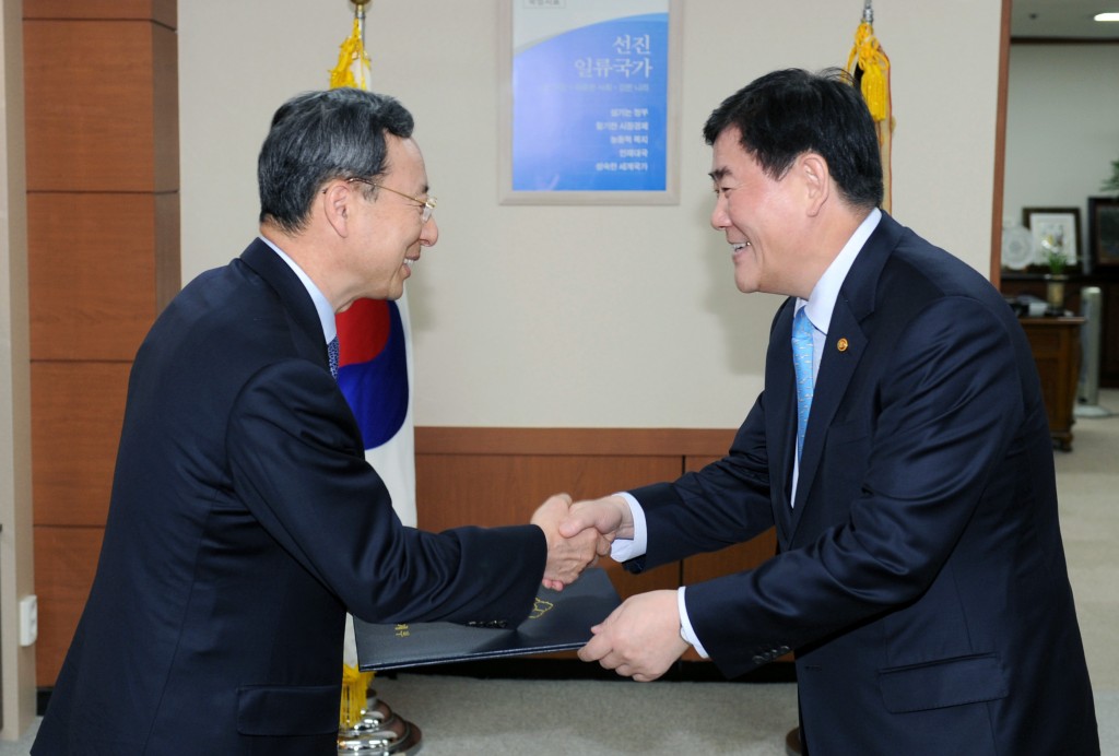 MKE Puts Former Samsung Officer at the Helm of Advanced National R&D Programs Minister of Knowledge Economy Choi Kyunghwan welcomes Hwang Chang-gyu (left), the former Samsung Electronics President, who was recently appointed to lead the Ministry’s research and development initiatives. date2010-04-23