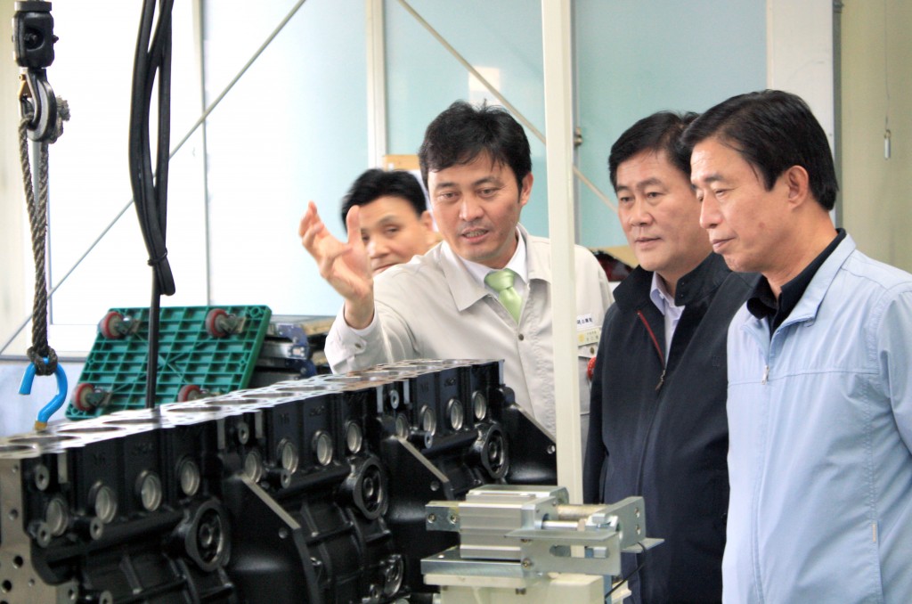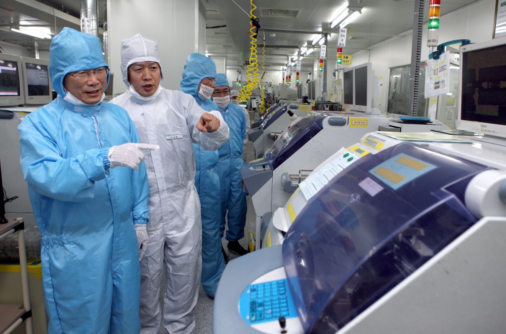 Minister of Knowledge Economy Lee Youn Ho observes the packaging process during a visit to a major LED chip manufacturing facility in Ansan on February 12. date2009-02-17