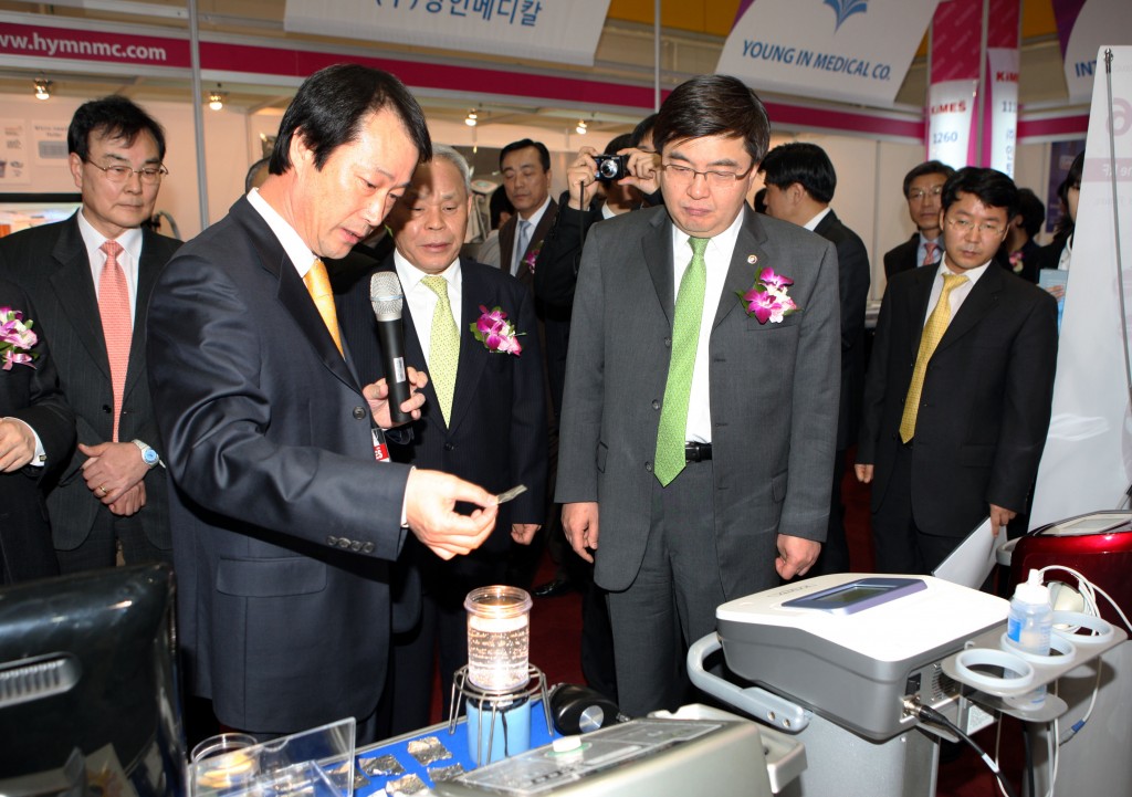 Vice Minister for Industry and Technology Rim Chemin observes an exhibit at the International Exhibition on Medical Devices in Seoul on March 12. Nearly 100 lawmakers and industry representatives were present at the opening ceremony. date2009-03-13
