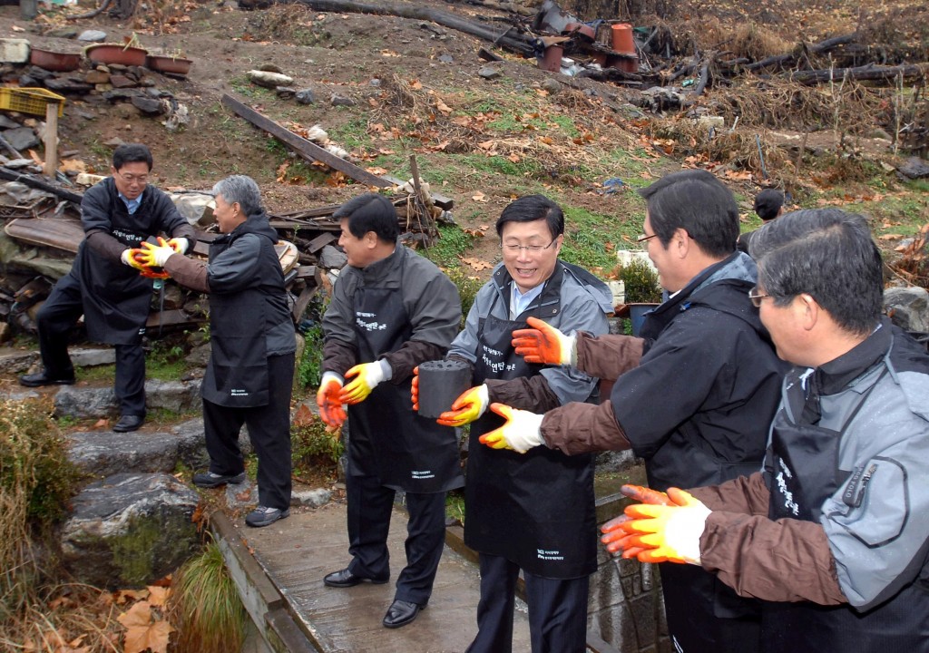 Lending a Hand Minister Lee Youn Ho and other officials from energy-related corporations joined in efforts to assist low-income households in installing heating equipment on November 27. date2008-12-04