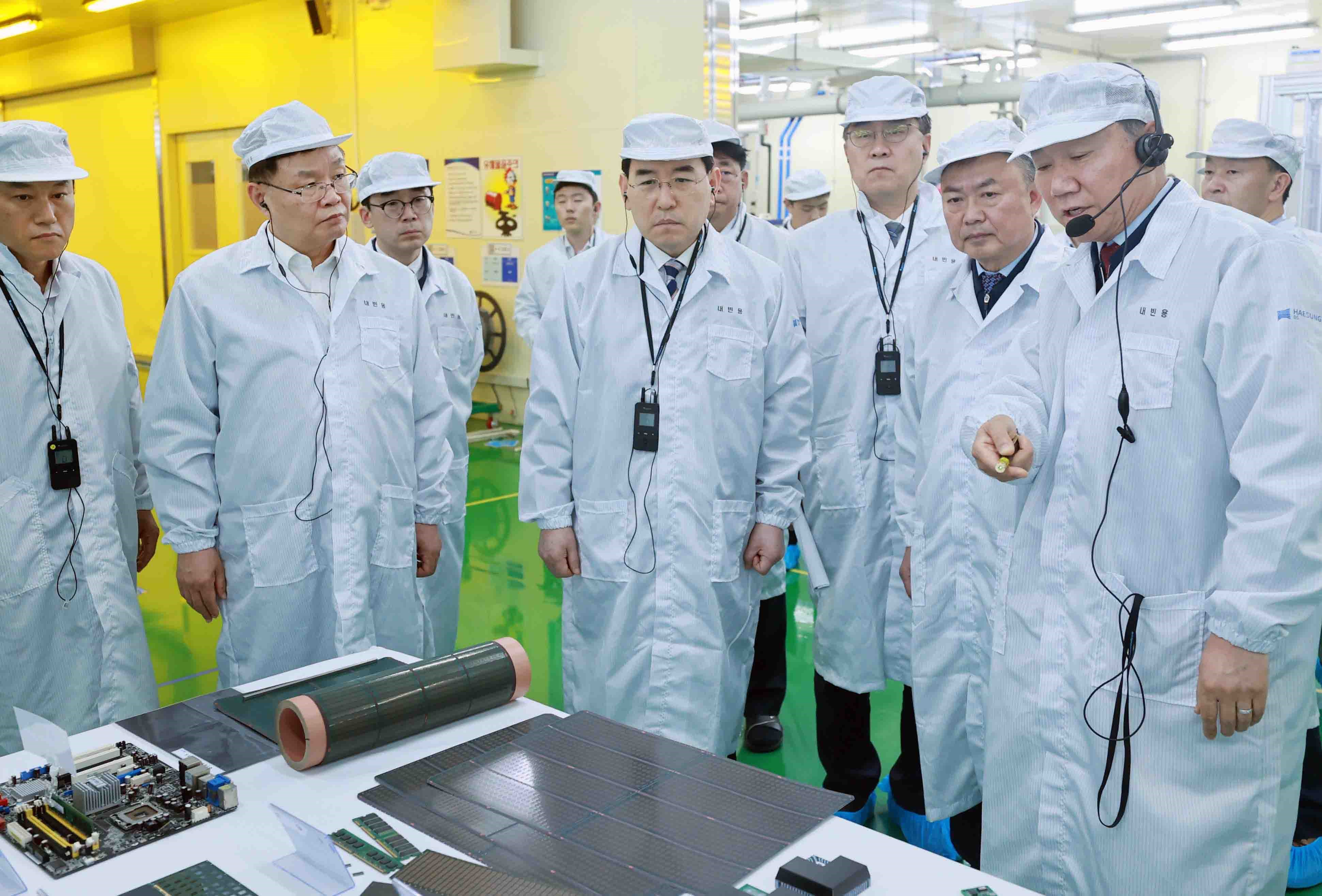 Trade, Industry and Energy Minister Lee Chang-yang visited Haesung DS, a semiconductor MPE (materials, parts, equipment) manufacturer located in Changwon-si, South Gyeongsang Province, on May 15 and received a company briefing from CEO Cho Byung-hak and toured IC package substrate production facilities and encouraged employees. date2023-05-17