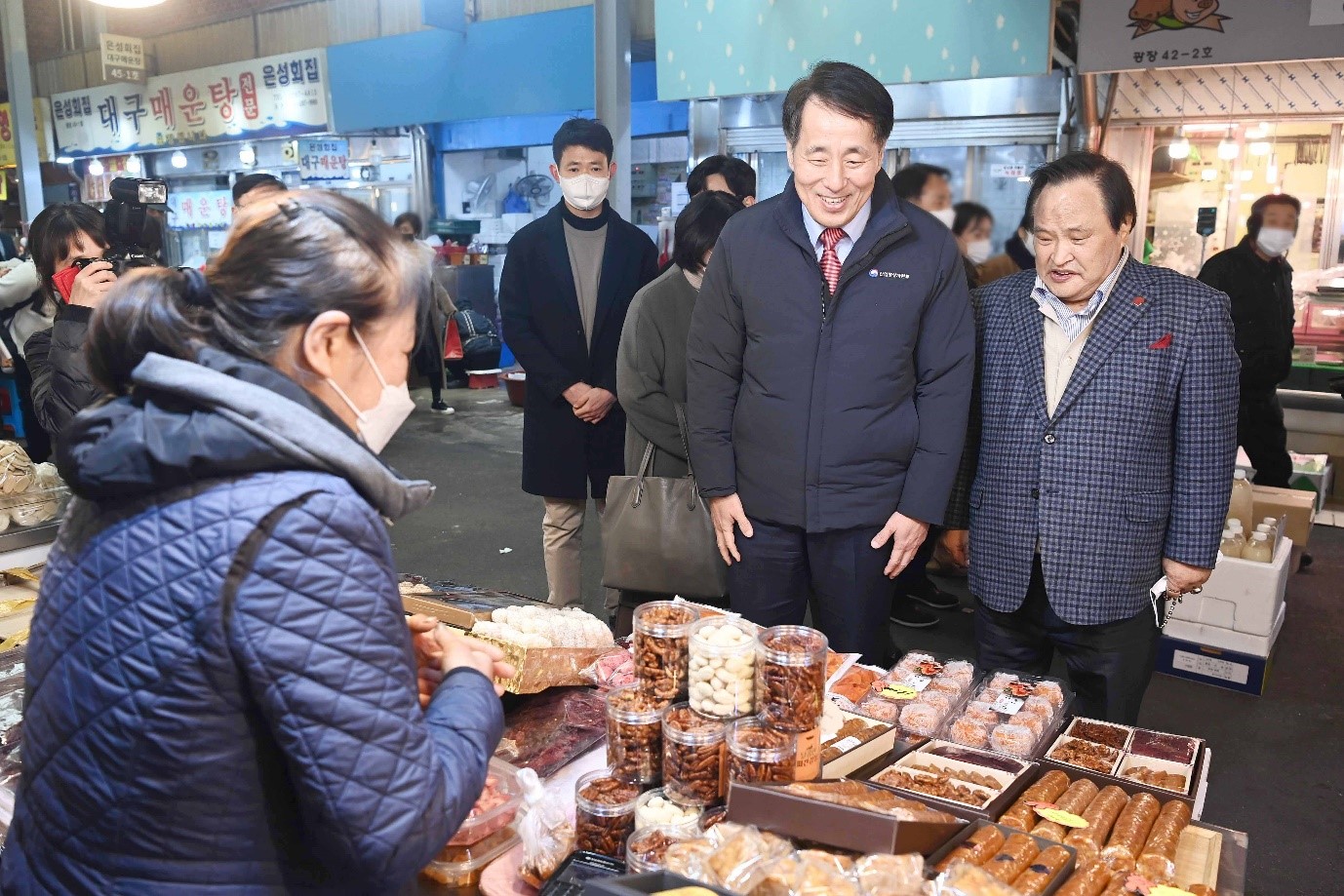 Trade, Industry, and Energy 1st Vice Minister Jang Young-jin visited the Gwangjang Traditional Market located in Jongno-gu, Seoul, on January 19 to inspect market prices and self-quarantine conditions ahead of Korea's Lunar New Year holidays. After receiving a briefing from Seoul Merchants Association Chairman Choo Gwi-sung on market management issues, Vice Minister Jang purchased holiday goods using an onnuri gift certificate. In view of the COVID-19 situation, the purchased goods were date2023-01-20