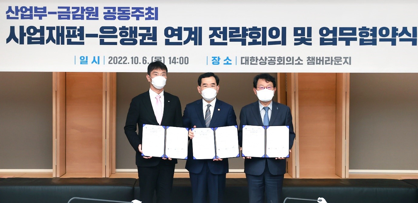 Trade, Industry and Energy Minister Lee Chang-yang presided the 1st Business Realignment & Banks Joint Strategy Meeting & MOU Signing Ceremony held at the Korea Chamber of Commerce and Industry (KCCI) on October 6 and signed the MOU on strengthening banks’ support for companies that grant approval for business realignment. The meeting was convened to discuss the establishment of a cooperation system between the Ministry and Korea’s Financial Supervisory Service (FSS) date2022-10-07