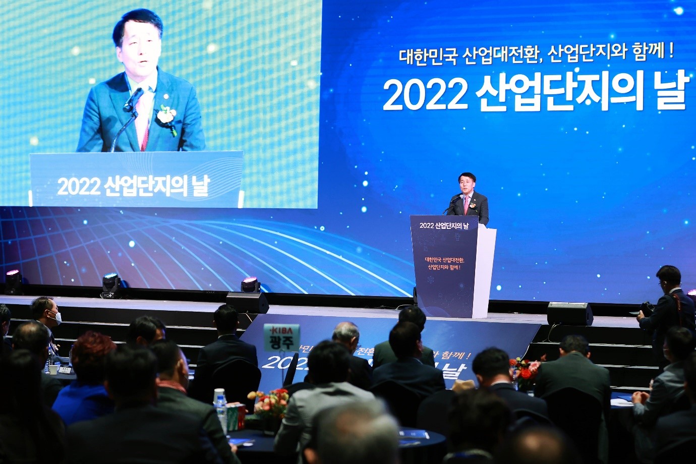 Trade, Industry and Energy 1st Vice Minister Jang Young-jin attended the ceremony for Industrial Complex Day 2022 on September 22 at G-Tower in Seoul, held to celebrate the achievements of Korea’s industrial complexes and encourage tenant companies and entrepreneurs. Vice Minister Jang delivered a congratulatory message and awarded 66 orders and medals of merit, including the Iron Tower Order of Industrial Service Merit given to K Elim New Star CEO Kim Gi-won, for contributing to date2022-09-26