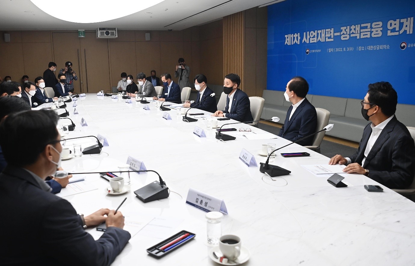 Trade, Industry and Energy 1st Vice Minister Jang Young-jin attended the 1st Business Realignment & Financial Policies Strategy Meeting held at the Korea Chamber of Commerce and Industry (KCCI) on August 3 to assess outcomes related to the launching of the Business Realignment Comprehensive Support Center for one-stop services. The Vice Minister gave opening remarks and participated in the signboard hanging ceremony to celebrate the launching of the center. The meeting was date2022-08-05