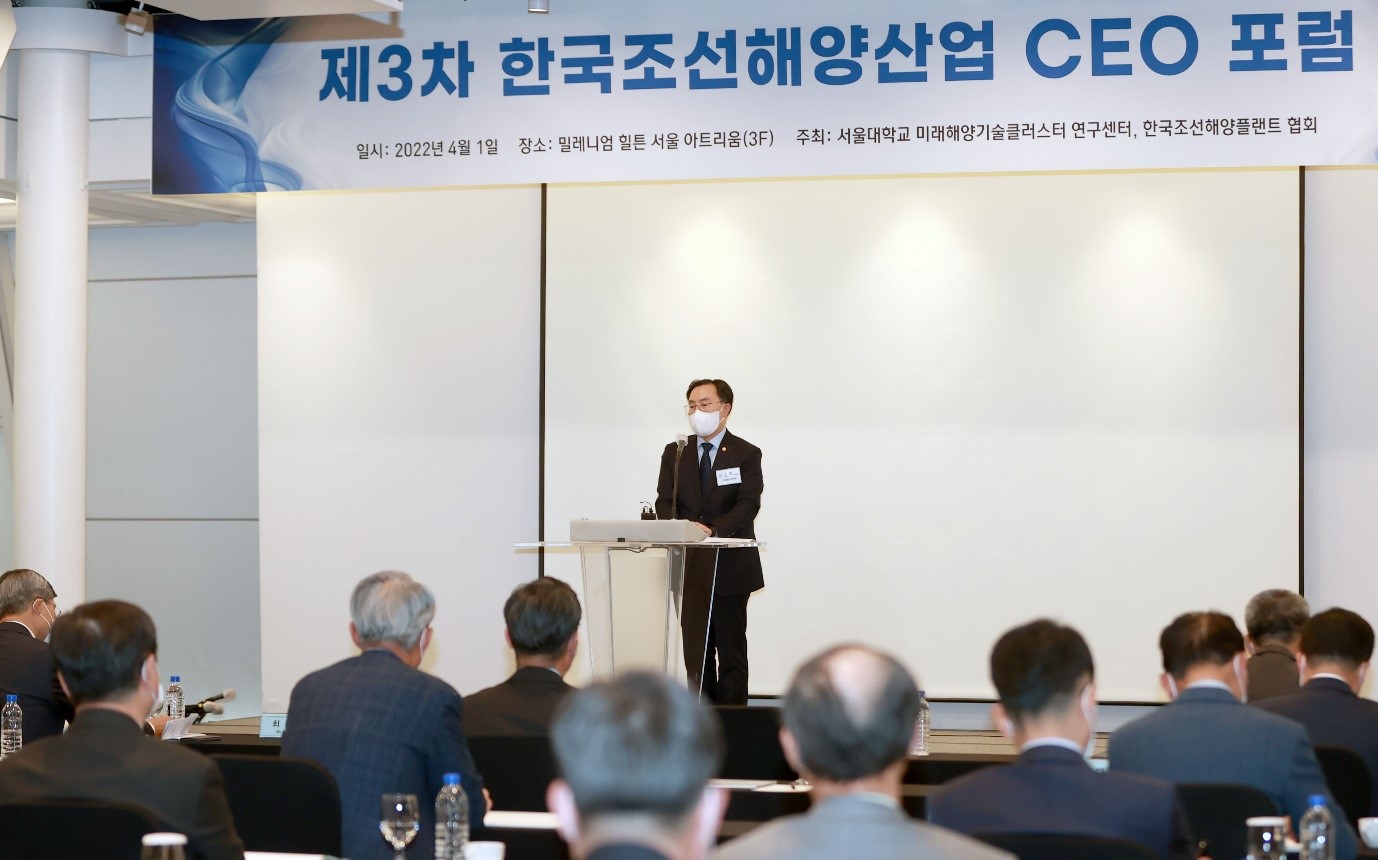 Trade, Industry, and Energy Minister Moon Sung-wook attended the 3rd Korea Shipbuilding and Marine Industry CEO Forum on April 1 at the Millennium Hilton Seoul for the assessment of production manpower and discussing measures for securing human resources in the future. In his congratulatory remarks, Minister Moon noted that Korea’s shipbuilding industry must change “from a labor-intensive and large-scale industry of the past, to a high value-added industry in line with the g date2022-04-05