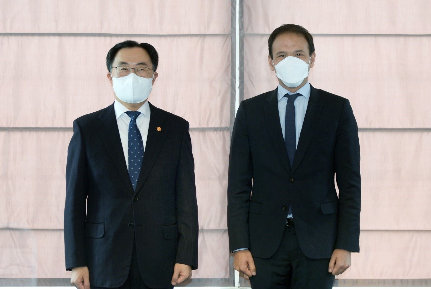 Trade, Industry and Energy Minister Moon Sungwook (left) met with the French Secretary of State for Digital Transition and Electronic Communications Cédric O in Seoul, on November 19, and the two countries agreed to expand cooperation in new industries and encourage exchange between digital startups. Minister Moon also mentioned Busan’s bid to host the 2030 World Expo, and asked for support. date2021-11-19