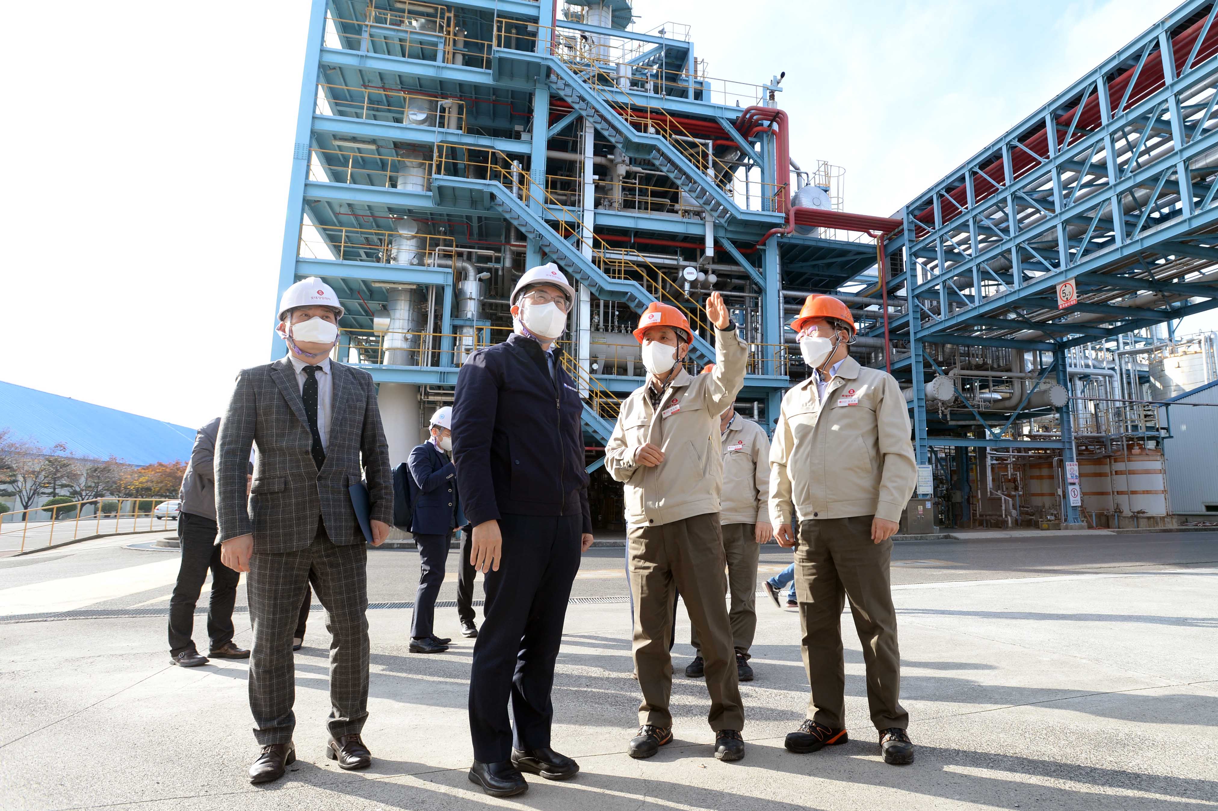 Trade, Industry and Energy Minister Moon Sungwook (second from the left) made an on-site visit to the plant of Lotte Fine Chemical Co., a local producer of urea solution, in Ulsan, on November 15, to check the situation at the production site amid the recent supply shortage. Minister Moon mentioned that thanks to the collaborative effort between the government and the private sector, the inspection process by China on 18,700 tons of urea export to Korea is under progress. Moon date2021-11-16