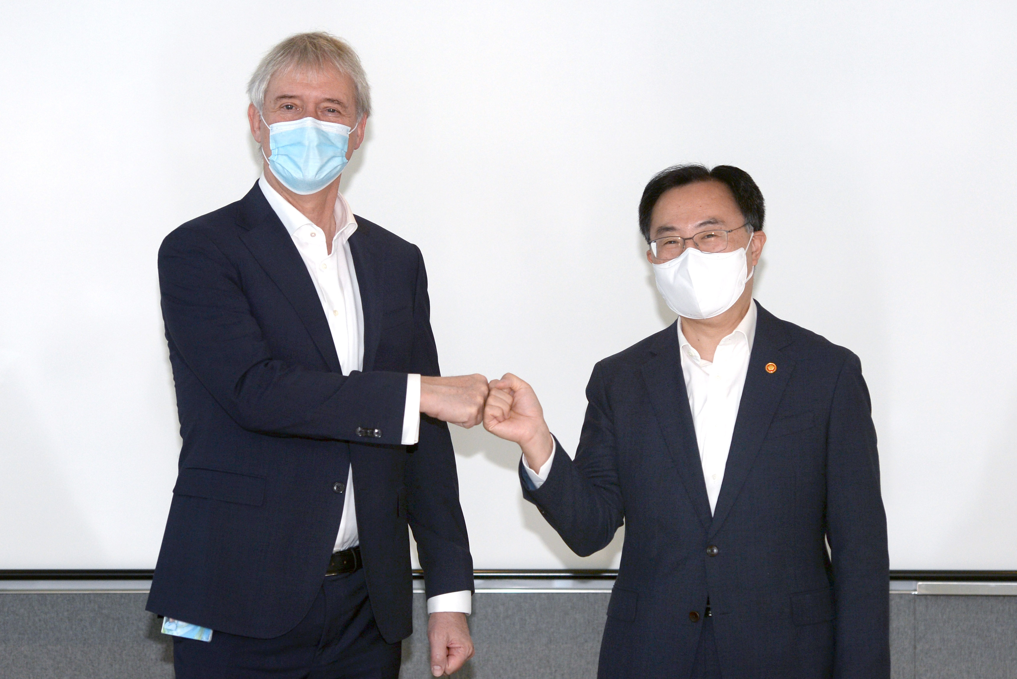 Trade, Industry and Energy Minister Moon Sungwook (right) met with ASML CEO Peter Wennink at ASML Korea’s headquarters in Hwaseong, on November 18, to discuss cooperative measures in the semiconductor sector with the global manufacturer of extreme ultraviolet (EUV) lithography equipment. ASML has announced its plans to invest KRW 240 billion (USD 229 million) in the Hwaseong semiconductor cluster, and the two sides agreed for a stronger cooperation for a stable supply of materials date2021-11-19