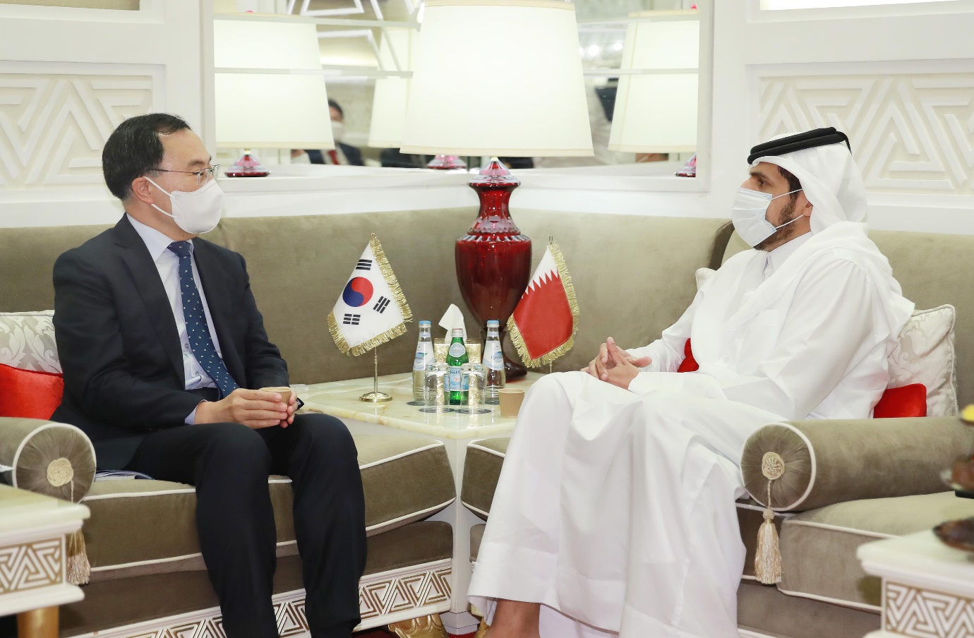 Trade, Industry and Energy Minister Moon Sungwook (left) met with his Qatari counterpart Sheikh Mohammed bin Hamad bin Qassim Al Abdullah Al Thani during his visit to Qatar, on October 24 (local time), and agreed to strengthen cooperation in bio-health and renewable energy. At a business roundtable organized by the Korean and Qatari Chambers of Commerce, representatives from shipbuilding, hydrogen and bio-health industries discussed cooperative measures in new industries in the post-cor date2021-10-24