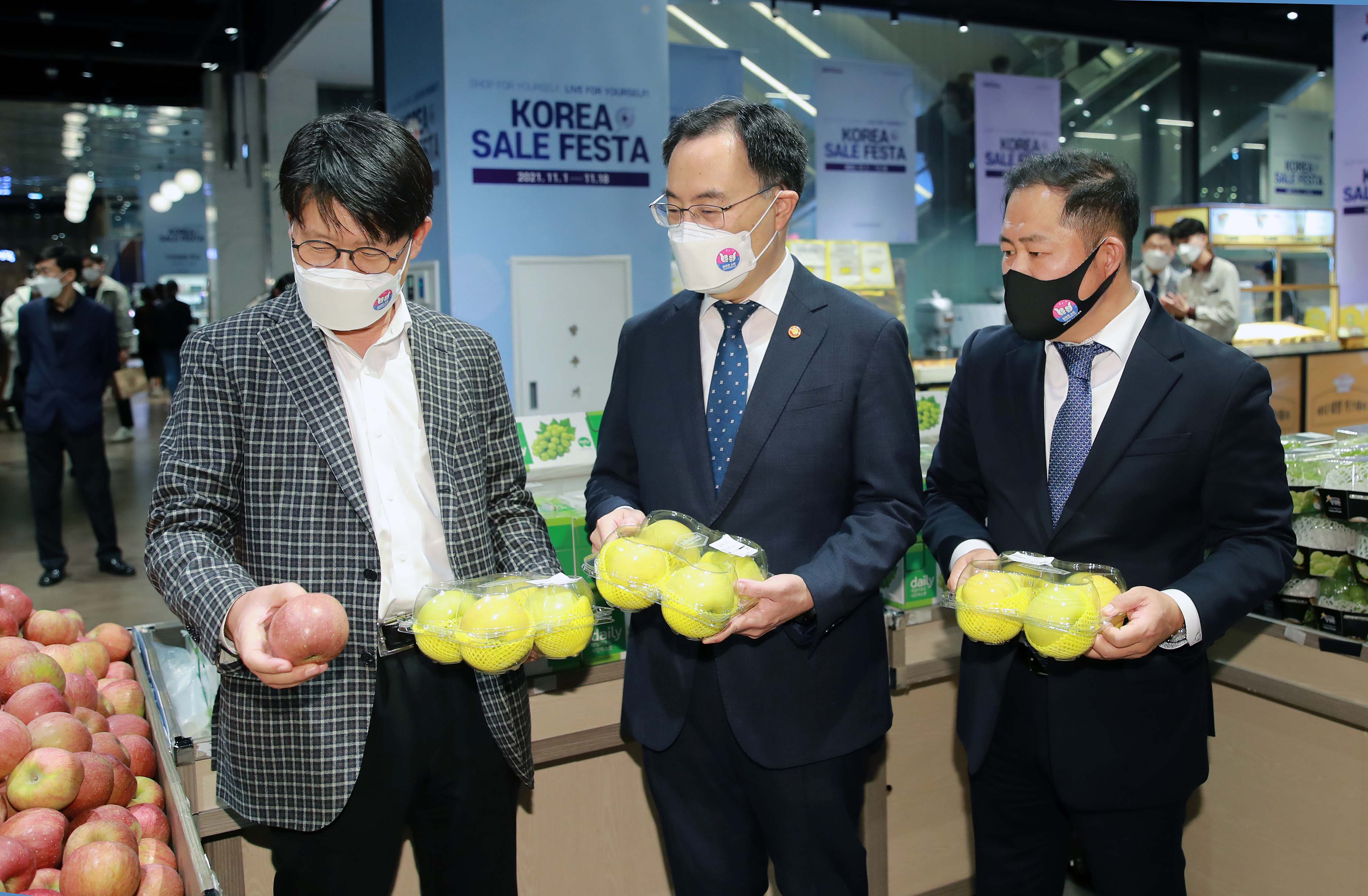 Trade, Industry and Energy Miniter Moon Sungwook (center) visited Shinsegae department store’s Daegu branch, on November 1, to check the 2021 Korea Sale Festa, a 15-day nationwide shopping event, taking place. The festival Is held to encourage private consumption, and is expected to revitalize the retail industry and small businesses suffering from the prolonged pandemic. date2021-11-01