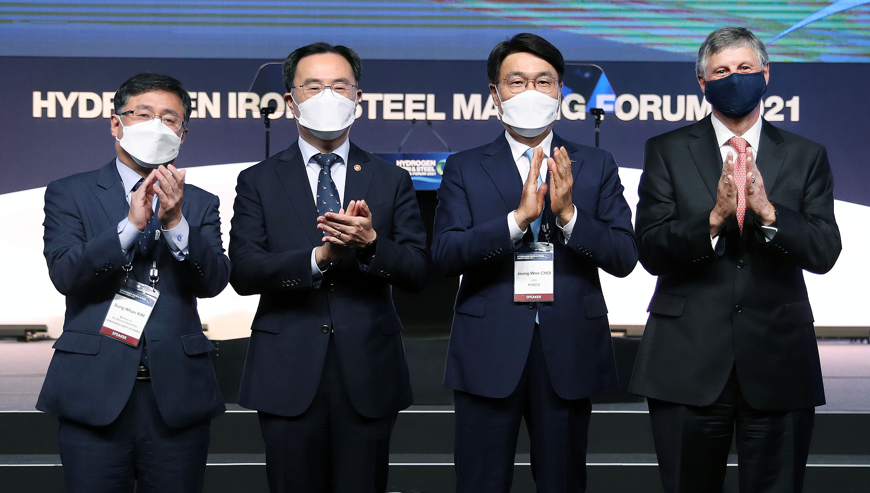 Trade, Industry and Energy Minister Moon Sungwook (second from the left) attended the Hydrogen Iron & Steel Making (HyIS) Forum, organized to start an industrywide discussion on measures to achieve carbon neutrality through hydrogen-based steelmaking. Minister Moon welcomed the industry’s technological innovation efforts to reduce carbon emissions, and said that the government plans to prepare a policy to stabilize the supply for green hydrogen. date2021-10-06
