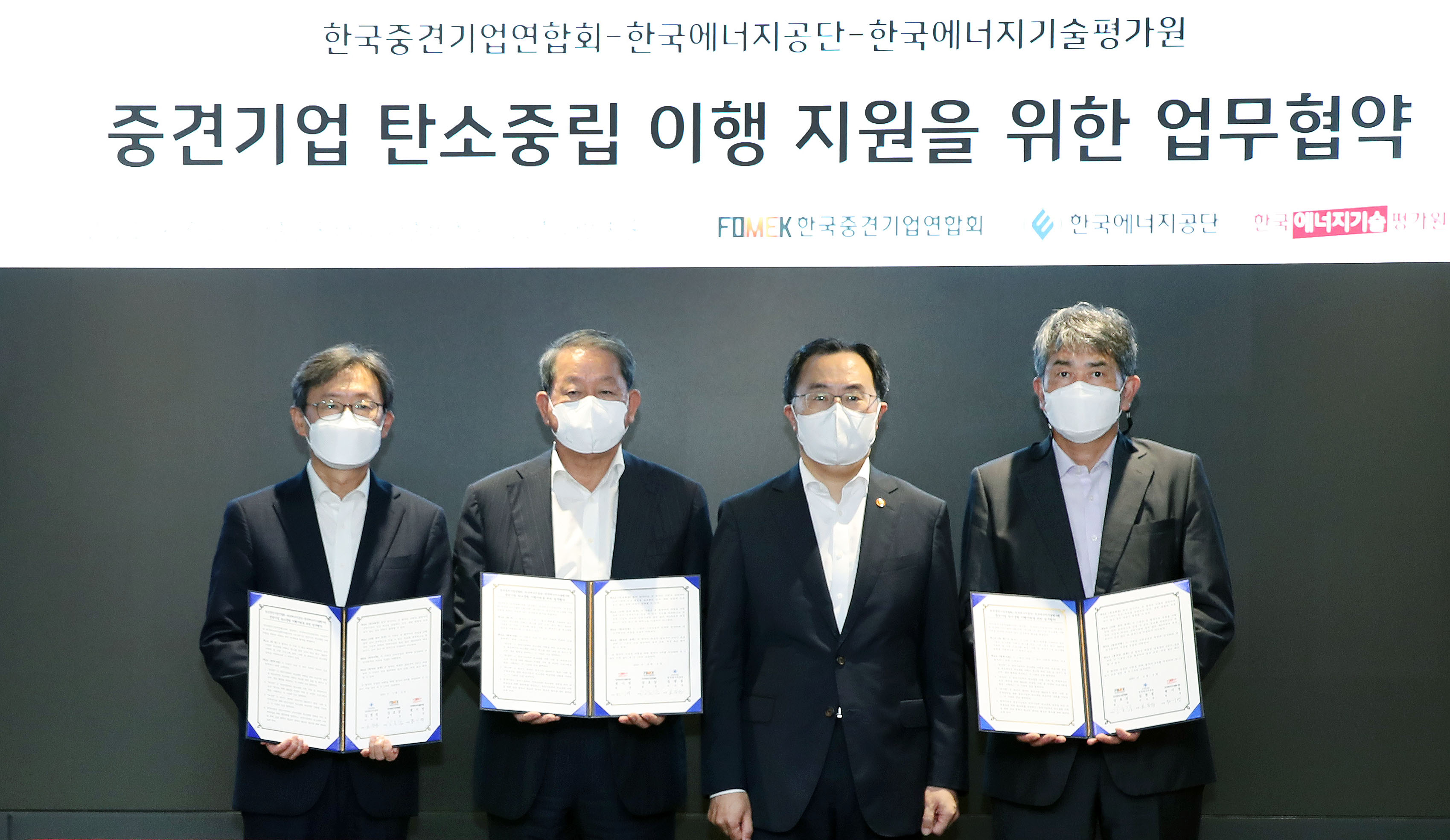 Trade, Industry and Energy Minister Moon Sungwook (second from the right) attended a meeting, on September 3, to create a cooperative system between middle market enterprises and energy agencies for ESG and carbon neutral goals. The Korea Energy Agency, the Korea Institute of Energy Technology Evaluation and Planning, and the Federation of Middle Market Enterprises in Korea signed a memorandum of understanding (MOU), and the state-run energy organizations promised to help middle market date2021-09-03