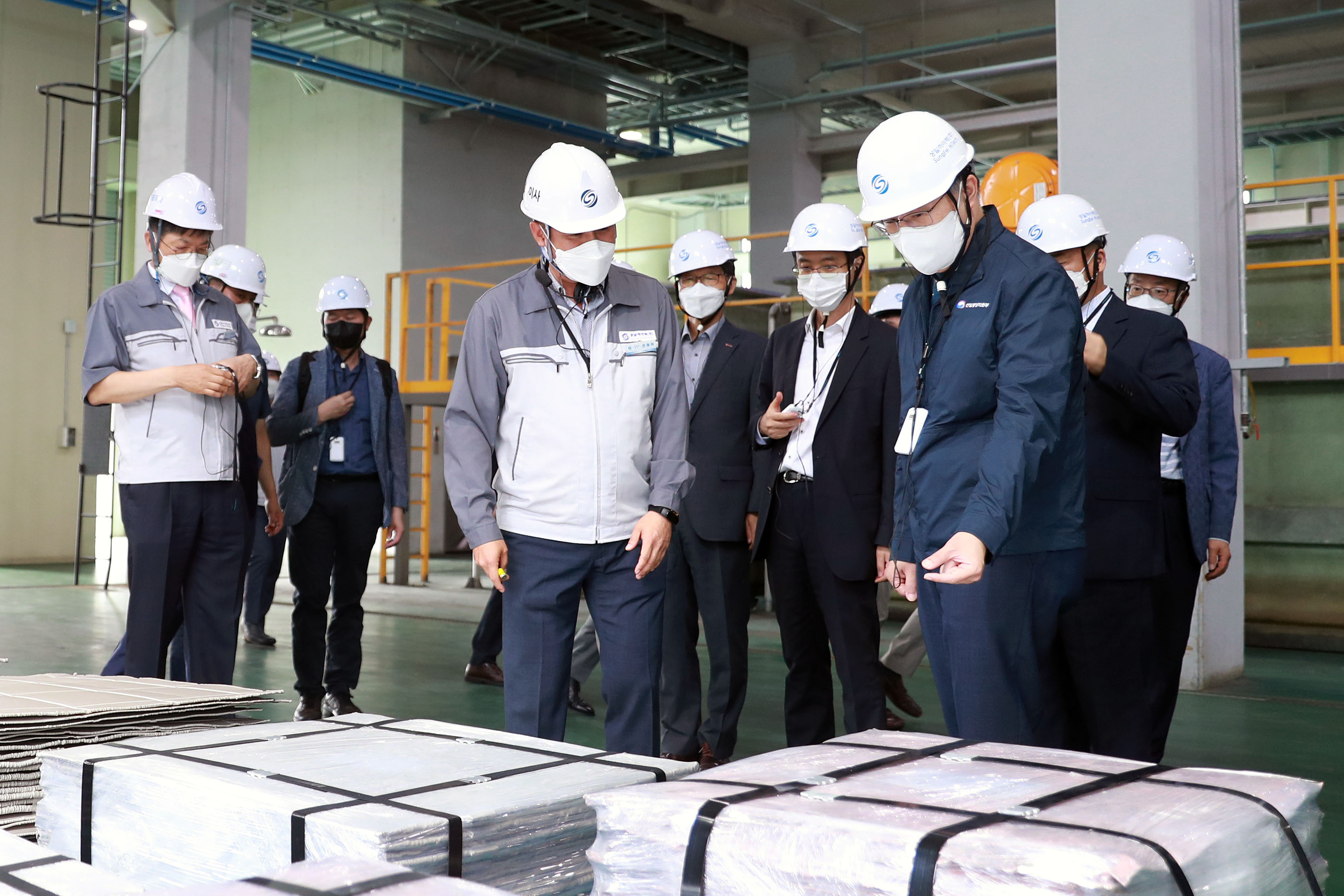 Trade, Industry and Energy Minister Moon Sungwook (right) made a visit to the plant of SungEel HiTech, a local supplier of cathode materials from recycled secondary batteries, in Gunsan, Jeollabukdo, on August 19, and met with industry representatives afterwards to discuss measures necessary to establish a stable supply chain of rare metals. Minister Moon said that the government will set up a comprehensive plan for metal reserves by the end of the year. date2021-08-19