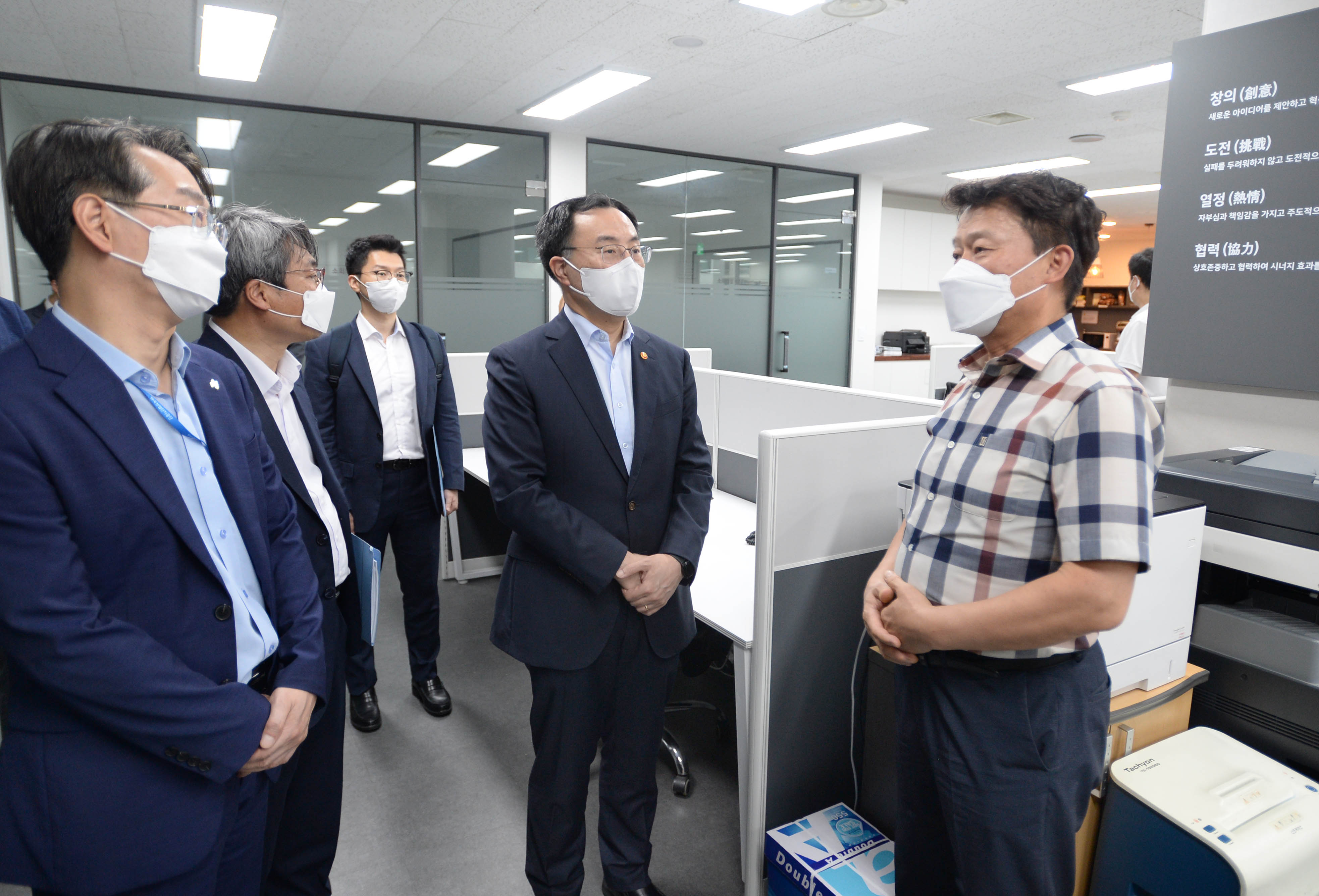 Trade, Industry and Energy Minister Moon Sungwook (second from the right) visited Daeryung Knowledge Industry Center, in Seoul, on July 19, to encourage industrial workers to take COVID-19 precautions as cases have surged recently. At a meeting with the Korea Industrial Complex Corporation, Minister Moon requested special efforts for a safe working environment since the virus can spread among transient population at industrial sites. date2021-07-19