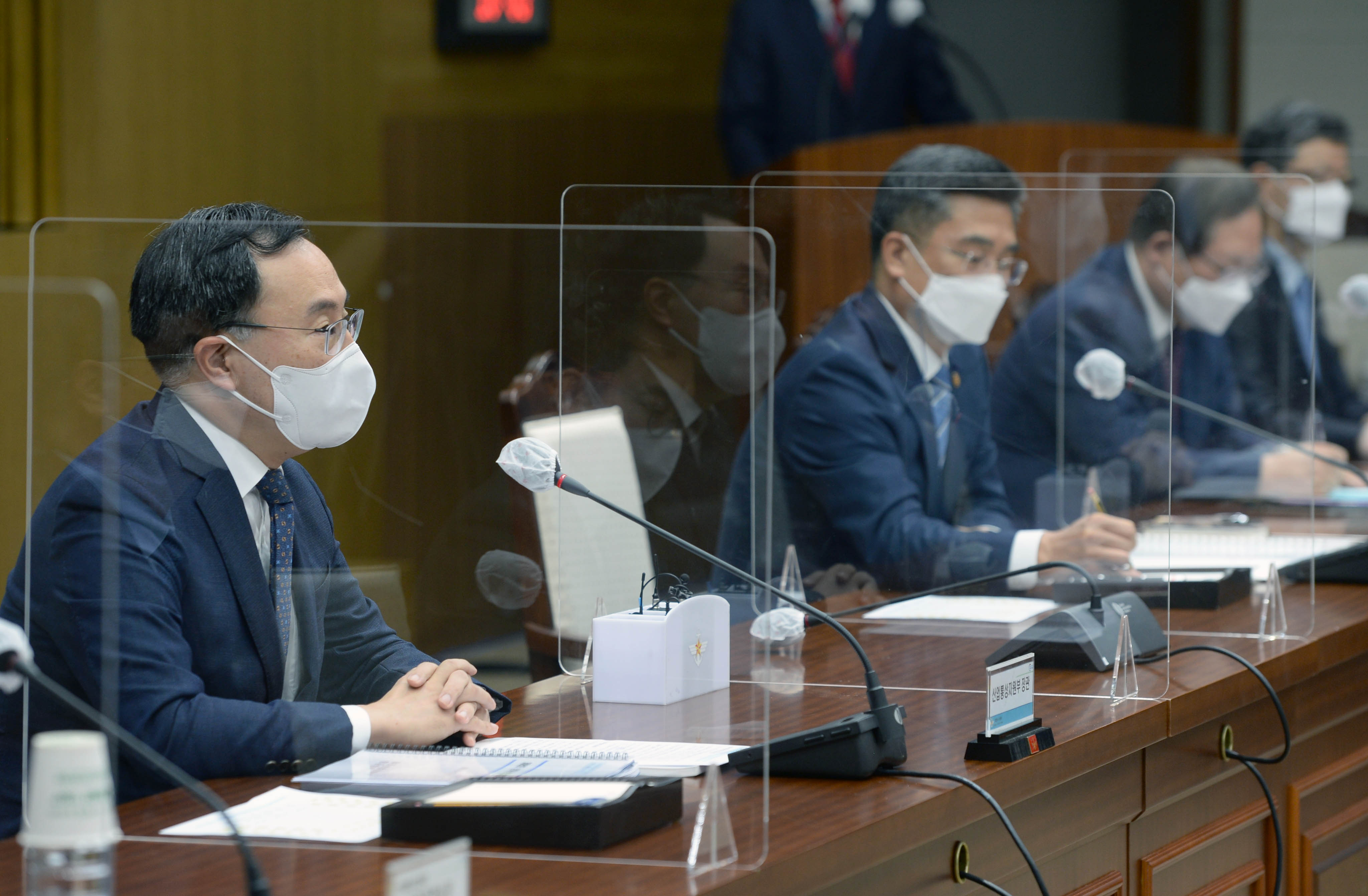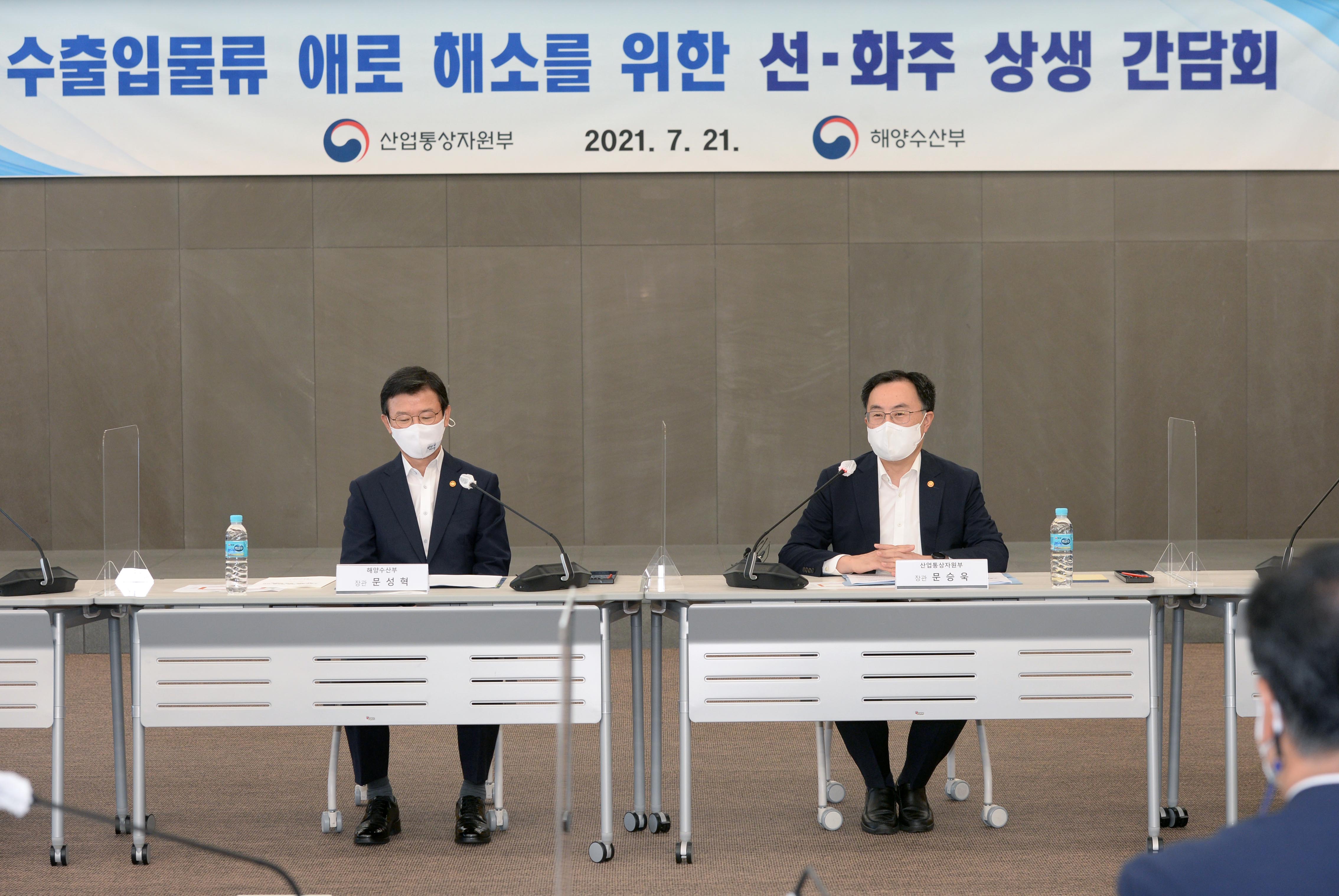 Trade, Industry and Energy Minister Moon Sungwook (right) held a joint meeting with the Ministry of Oceans and Fisheries and the shipping industry representatives, on July 21, to discuss ways to resolve difficulties with logistics resulting from shipping container shortages and high freight rates. At the meeting, the ministries agreed to increase the shipping space for peak volumes in the third quarter and expand support for freight charges. date2021-07-21