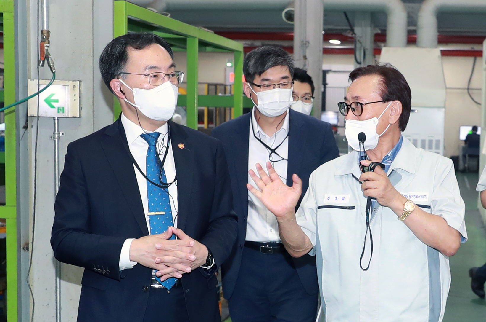 Trade, Industry and Energy Minister Moon Sungwook (left) visited the plant of Dong-A Precision Industrial Company, a local mold manufacturer, in Bucheon, Gyeonggi Province, on July 12, to encourage the firm’s introduction of smart robots to the manufacturing process, thereby reducing working hours and improving product quality. After the visit, Minister Moon met with root industry representatives and emphasized the need for qualitative growth centered on technological innovation in order t date2021-07-12