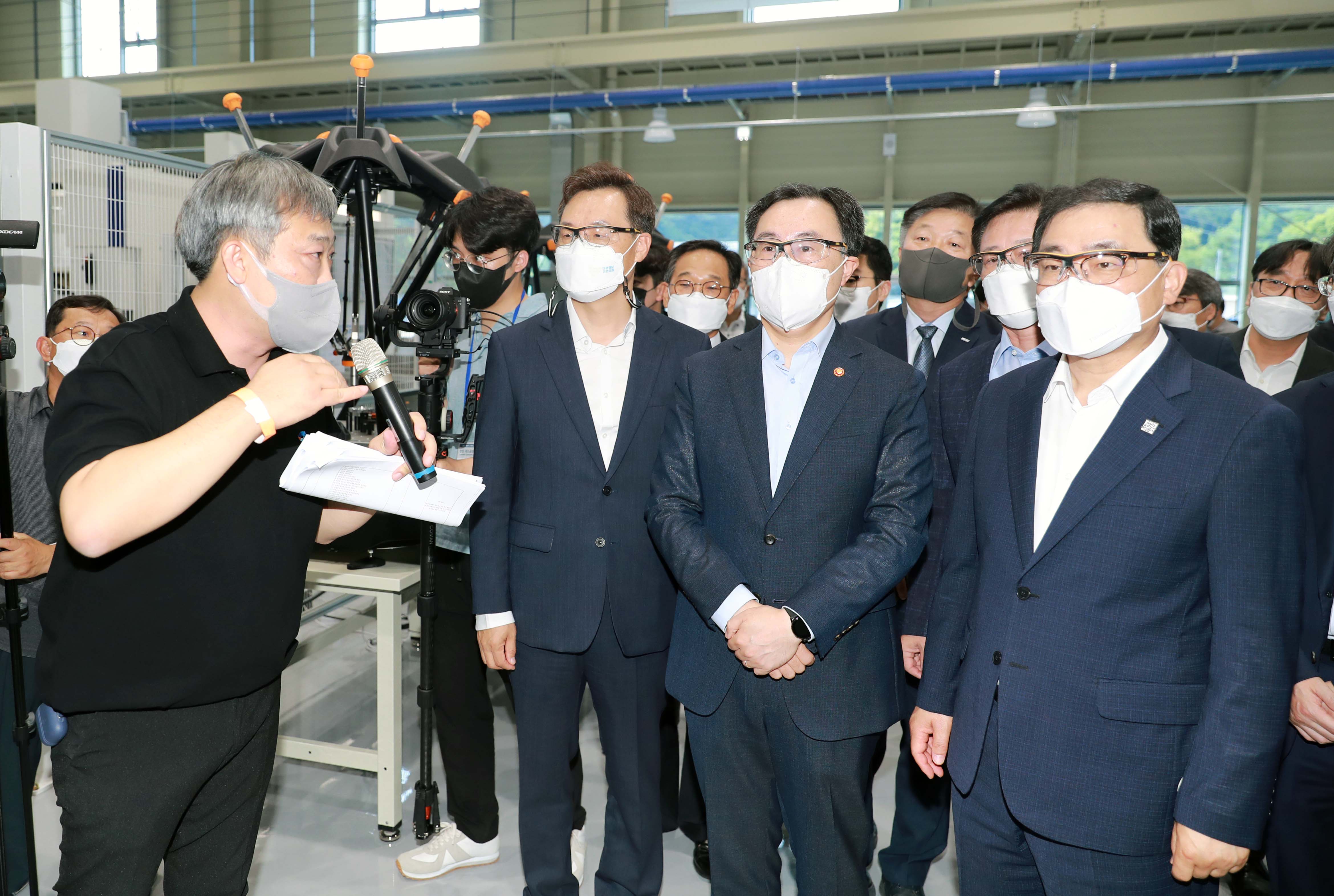 Trade, Industry and Energy Minister Moon Sungwook (second from the right) visited Changwon, on July 28, to encourage the opening of a smart manufacturing demo factory and the construction of a liquid hydrogen plant. The smart manufacturing demo factory, built as part of the Smart Green Industrial Complex Strategy, incorporates advanced ICT technologies to increase productivity and boost production of high value-added products. The liquid hydrogen plant, when its construction is date2021-07-28