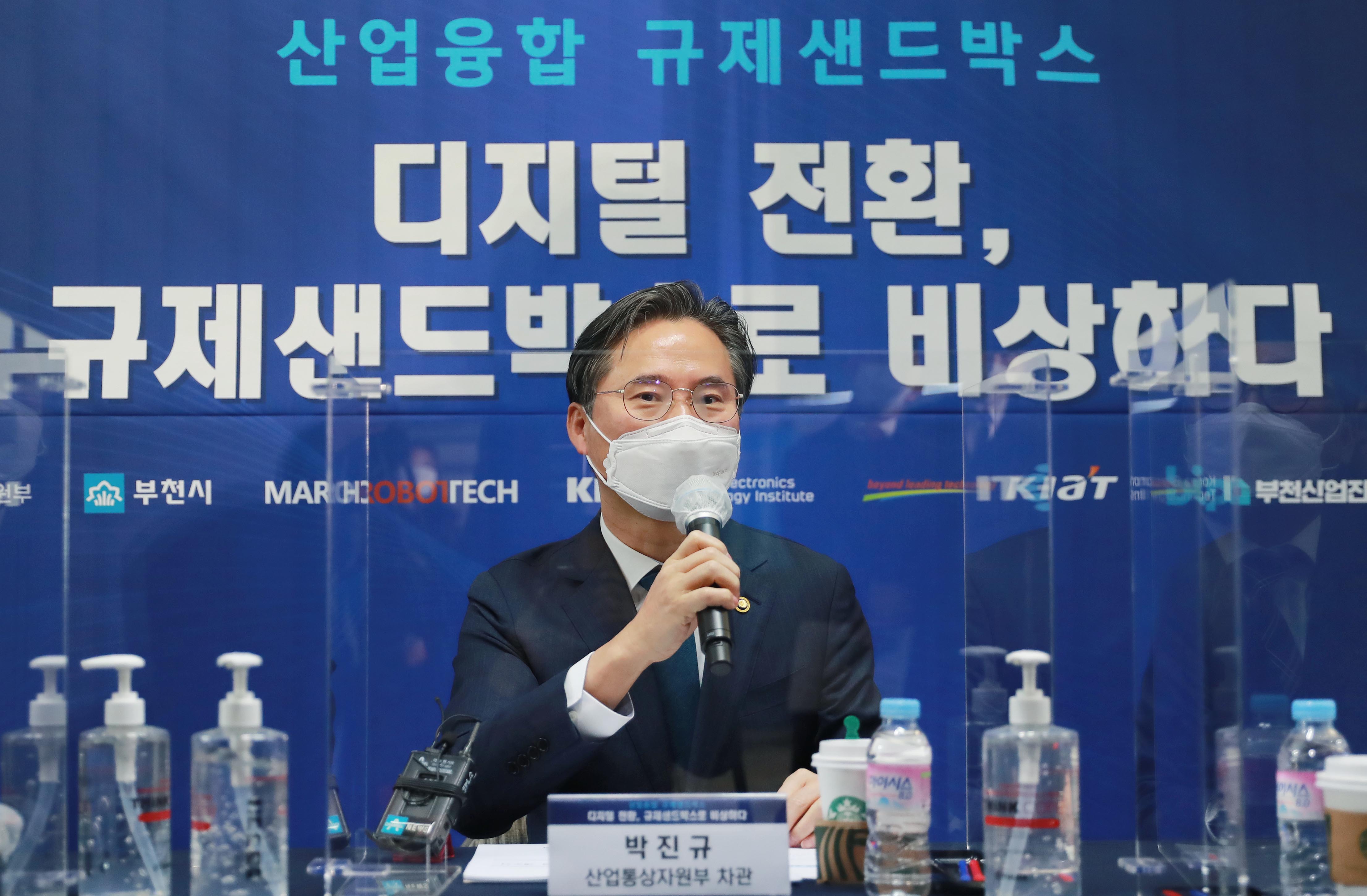 Trade, Industry and Energy Vice Minister Park Jin-kyu made an on-site visit to Maro Robot Tech, a local maker of smart parking robots using QR code recognition, in Bucheon, Gyeonggi Province, on February 26, to encourage the innovative accomplishment of industrial digital transformation under the regulatory sandbox program.The Ministry has approved 63 business items applied to a regulatory sandbox program last year, and aims to approve a total of 100 this year in support of innovative local busi date2021-02-26