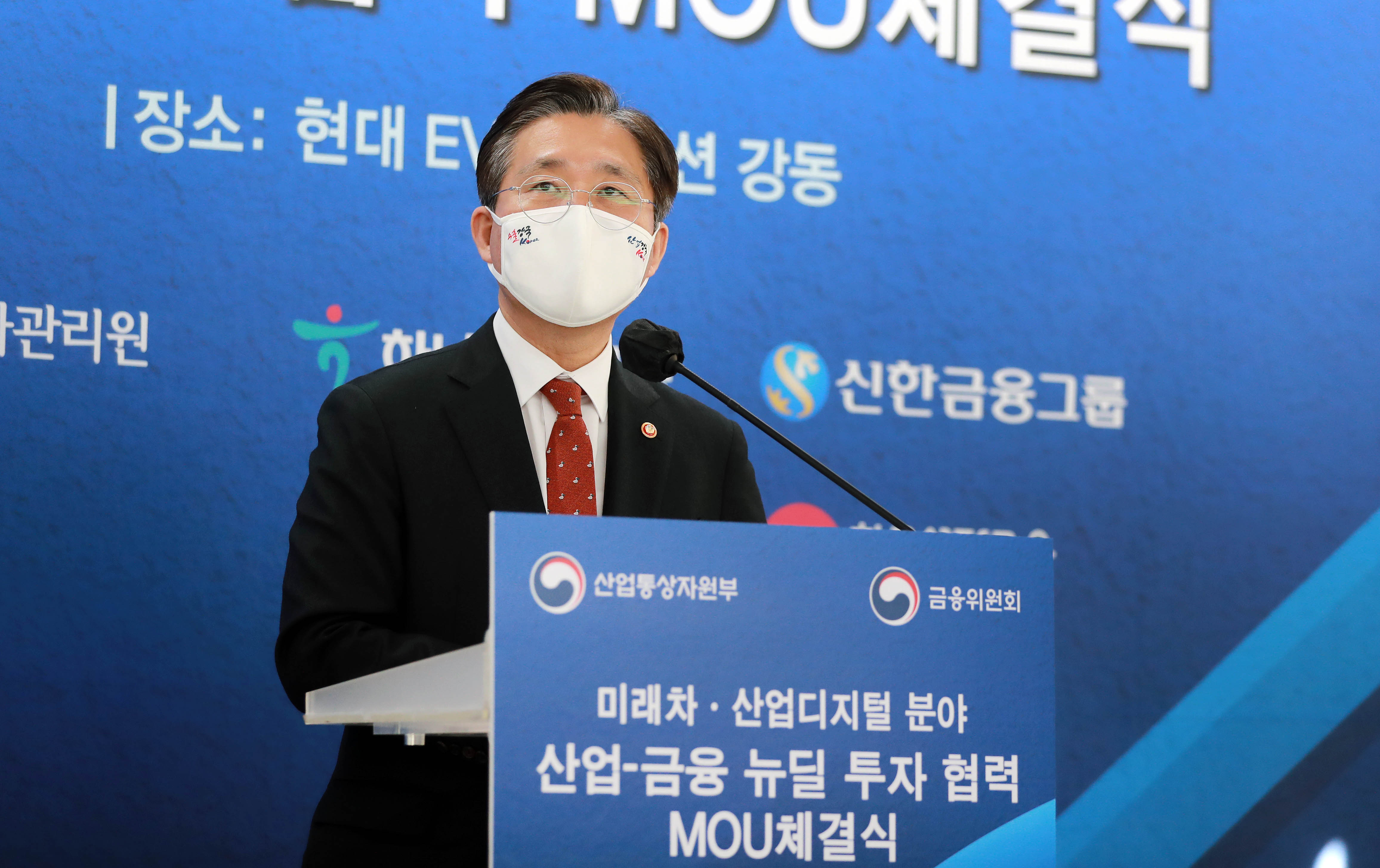 Trade, Industry and Energy Minister Sung Yunmo attended a memorandum of understanding (MOU) signing ceremony for New Deal investment cooperation in the areas of future cars and industrial digitalization at the Hyundai EV Station in Seoul, on February 4. The government and private investors including Hyundai Motor Group, the Korea Evaluation Institute of Industrial Technology (KEIT), and the Korea Institute for Advancement of Technology (KIAT) will invest a total of 200 billion won to th date2021-02-04