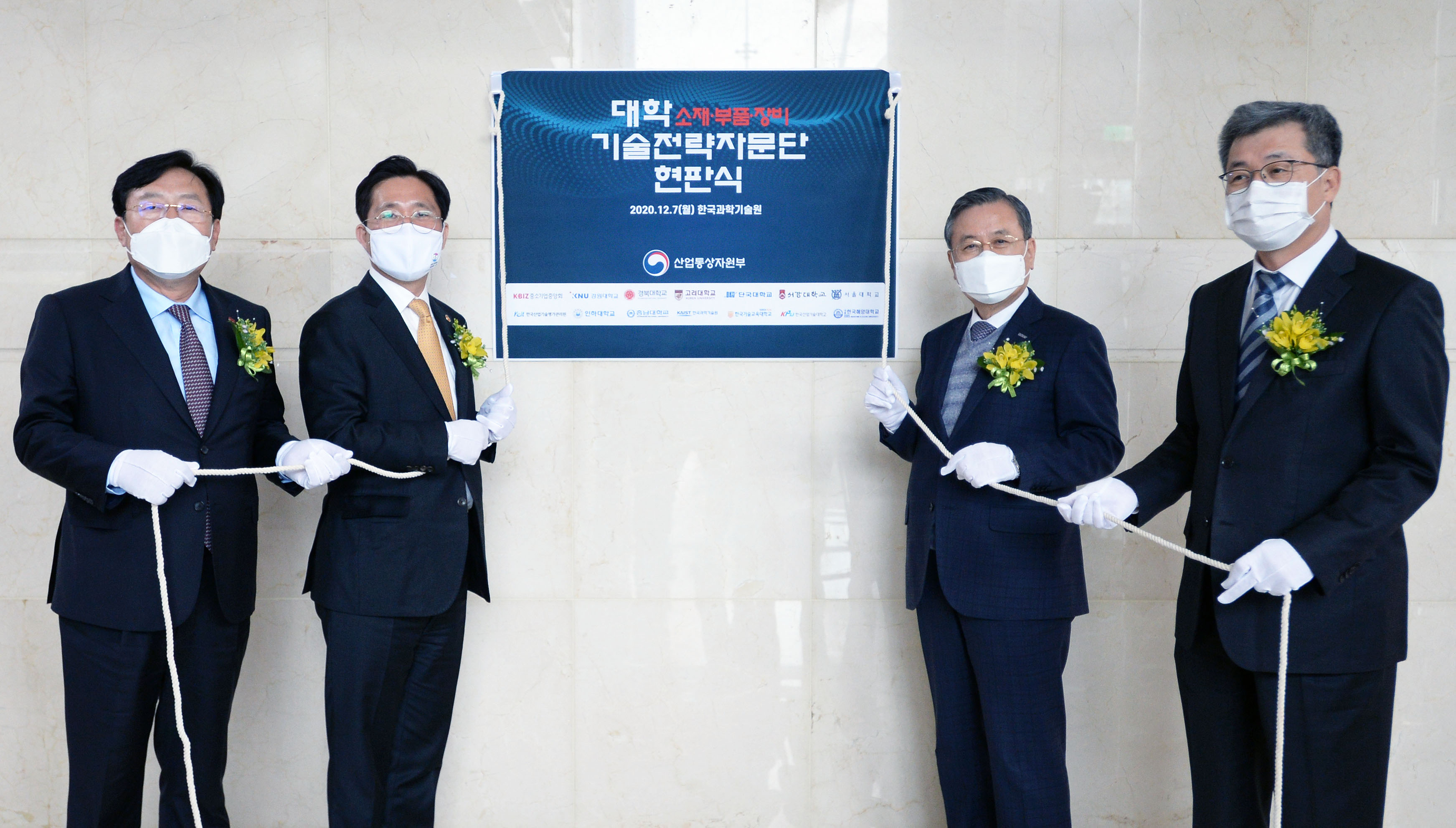 Trade, Industry and Energy Minister Sung Yun-mo (second from the left) attended the launching ceremony for an advisory group with the aim of providing human resources and technological support to the materials, parts and equipment companies at the Korea Advanced Institute of Science and Technology (KAIST), on December 7. Twelve universities with technological specialties in different fields were selected for the advisory group, and the government will invest a total of 81.3 billion won over a th date2020-12-08