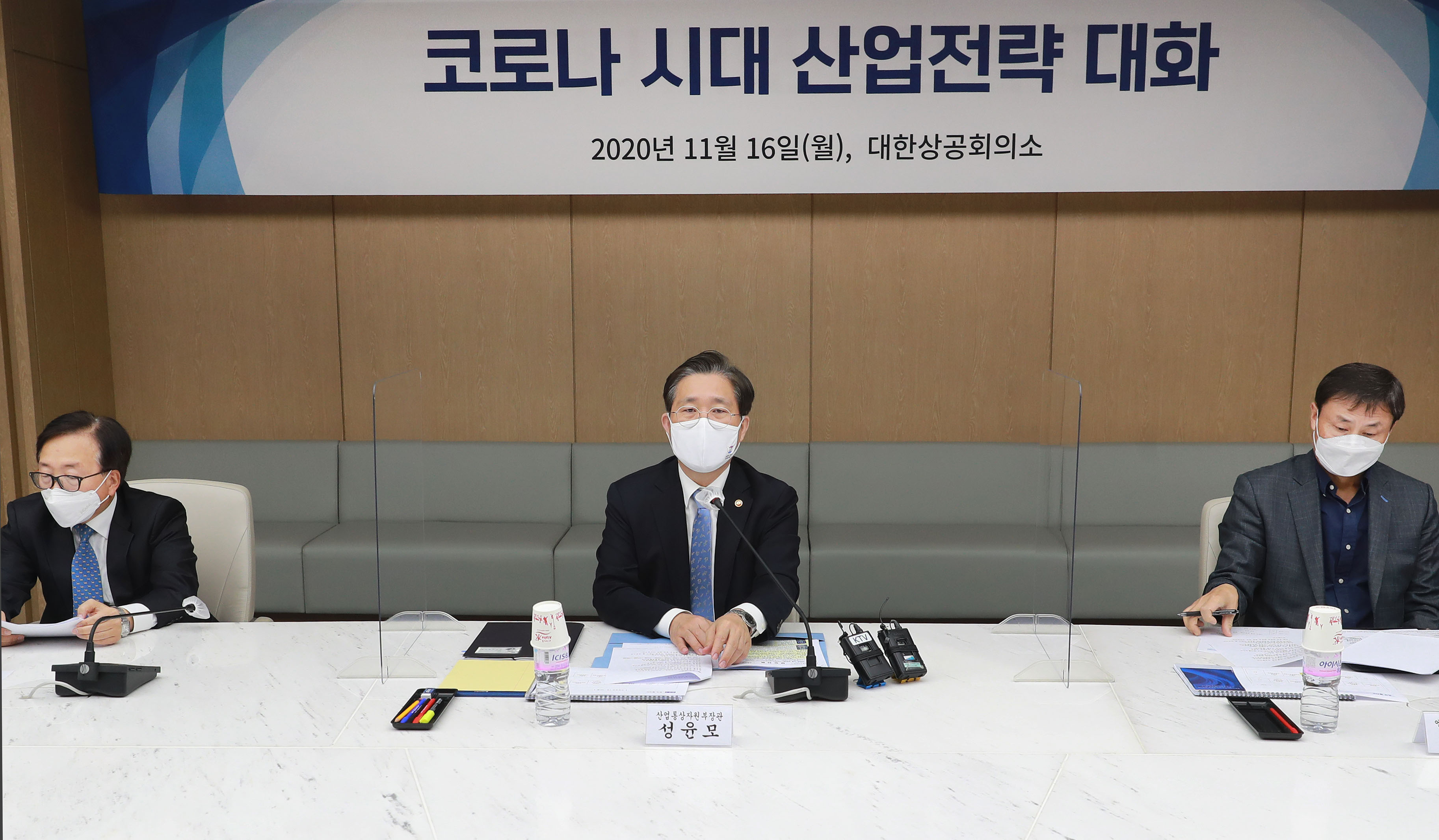 Trade, Industry and Energy Minister Sung Yun-mo (center) held a meeting with representatives of major research institutes in Seoul on November 16, to discuss the future direction for industrial policy in response to the prolonged COVID-19 crisis.At the meeting, Minister Sung mentioned three current issues surrounding Korea’s industrial environment – COVID-19, climate change, and the U.S. presidential election.He went on to talk about three industrial policy strategies to respond date2020-11-16