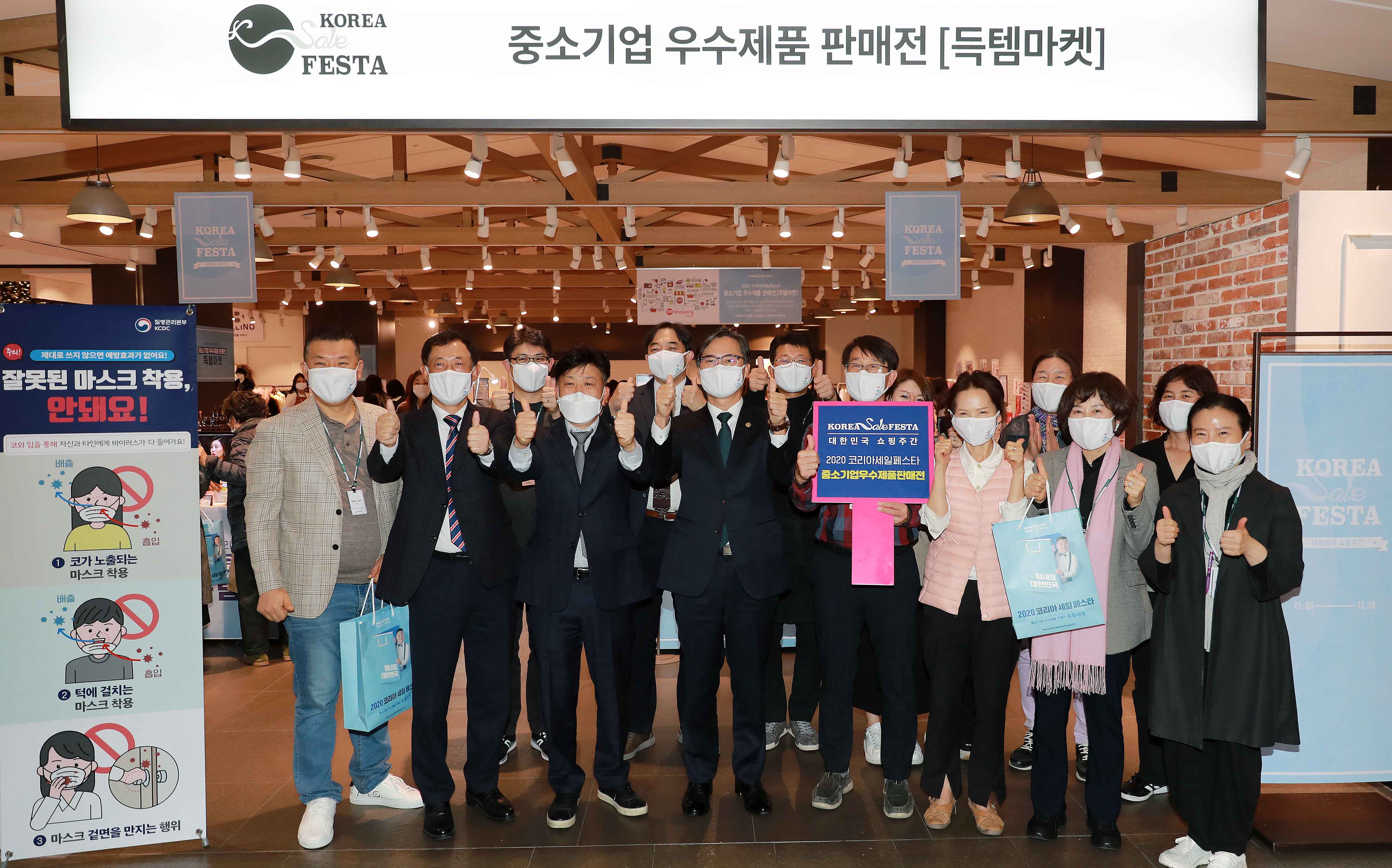 Trade, Industry and Energy Vice Minister Park Jin-kyu (center) made an on-site visit to the exhibition for excellent products by small and medium-sized businesses in Pangyo on November 11, held as part of the 2020 Korea Sale Festa. The event is designed to encourage small and medium-sized enterprises experiencing hardships from COVID-19 and promote well-made products as well as open up sales channels for them. A total of 529 companies will participate in the event via four offline store date2020-11-11