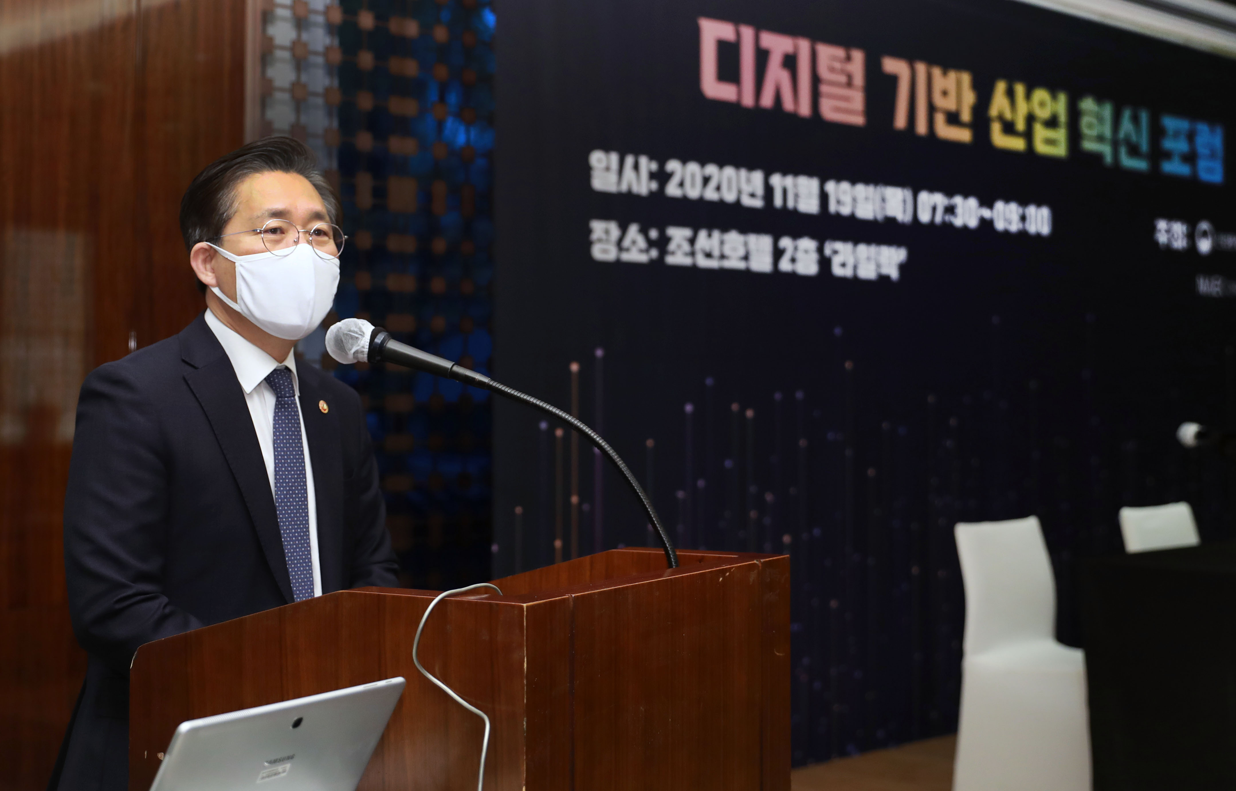 Trade, Industry and Energy Minister Sung Yun-mo attended the Digital-based Industrial Innovation Forum, co-organized by the National Academy of Engineering of Korea, in Seoul on November 19, to discuss innovative growth strategies for digital-based industries. Minister Sung emphasized the importance of industrial digital transformation in the private sector, and encouraged engineering technologists to take leading roles in the data sharing, industry-academia-research partnerships, and c date2020-11-19