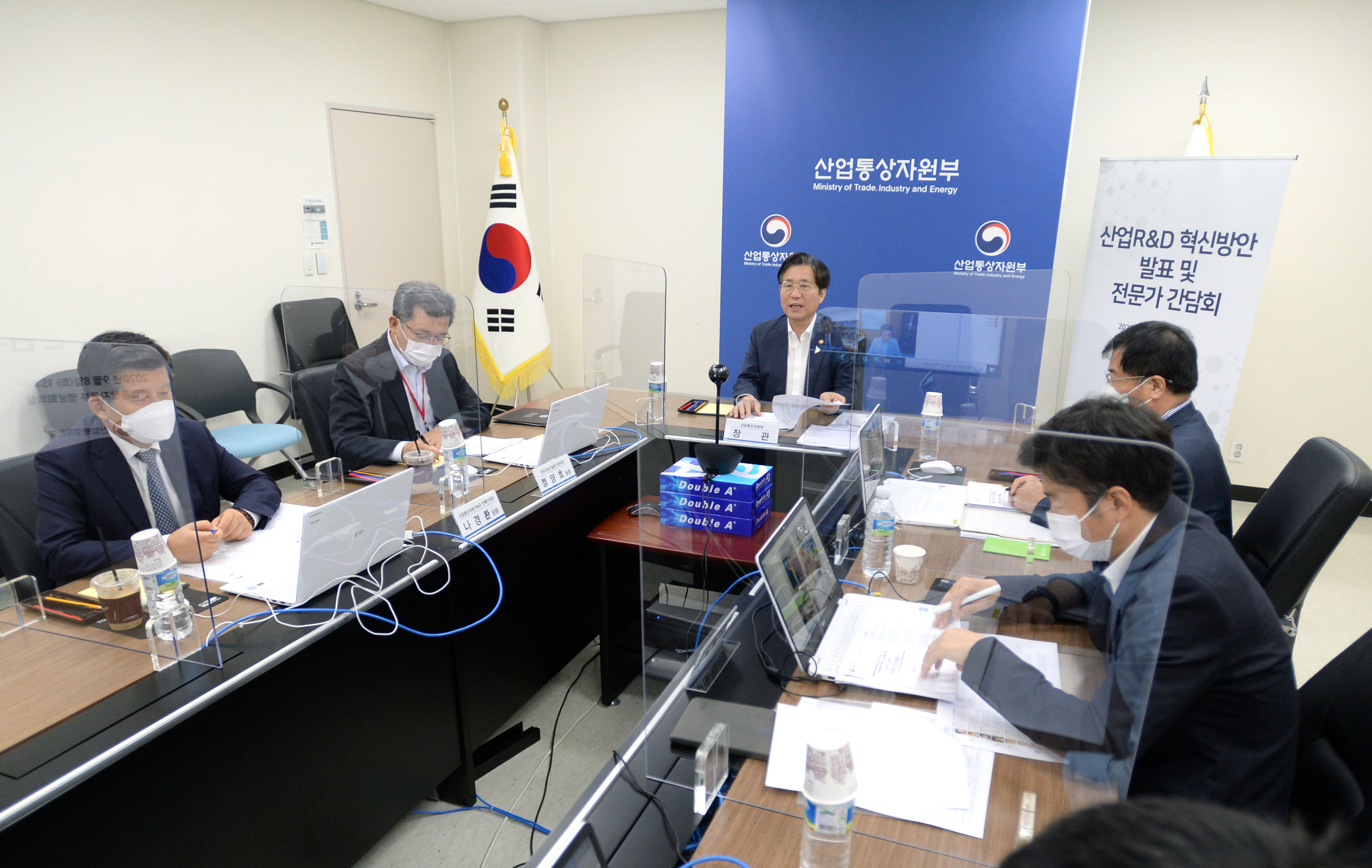 Trade, Industry and Energy Minister Sung Yun-mo (center) held a virtual meeting with representatives from the industry, academia, and research institutes, on September 8, to discuss the market-oriented R&D policy innovation plan amid uncertainties presented by COVID-19 and the digital transition.The Ministry will allow more flexibility to R&D projects by lifting regulations for outstanding institutes in revising and adjusting research goals according to the market condition, encourage ma date2020-09-08