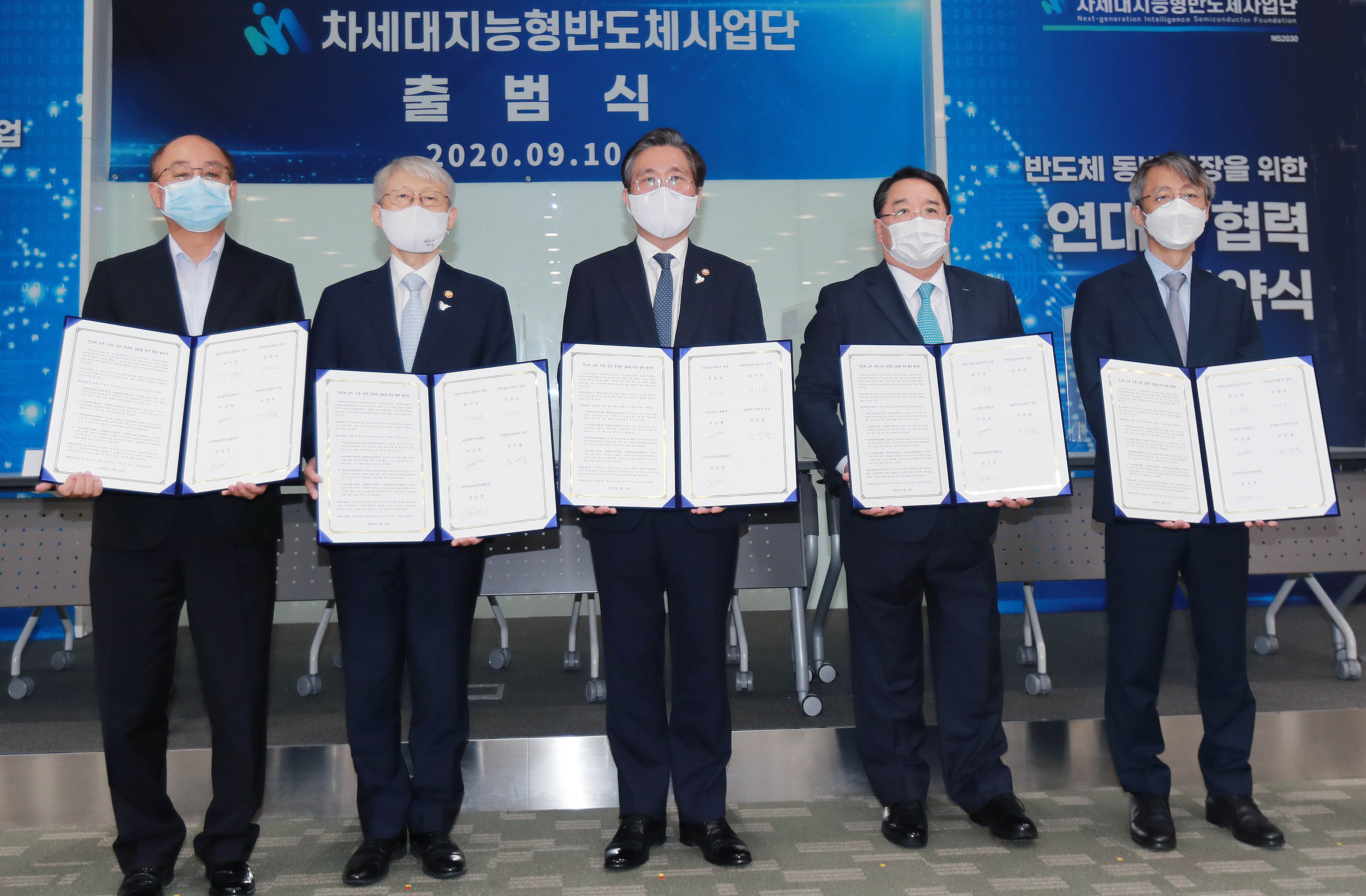 Trade, Industry and Energy Minister Sung Yun-mo (center) attended a signing ceremony for the memorandum of understanding (MOU) aimed to boost the development of the next generation smart semiconductors at Korea Semiconductor Industry Association in Pangyo, Gyeonggi Province, on September 10. The ceremony was attended by Science and ICT minister Choi Ki-young as well, and the two ministries promised to put efforts together for the technological competitiveness of semiconductor materials, parts, a date2020-09-10