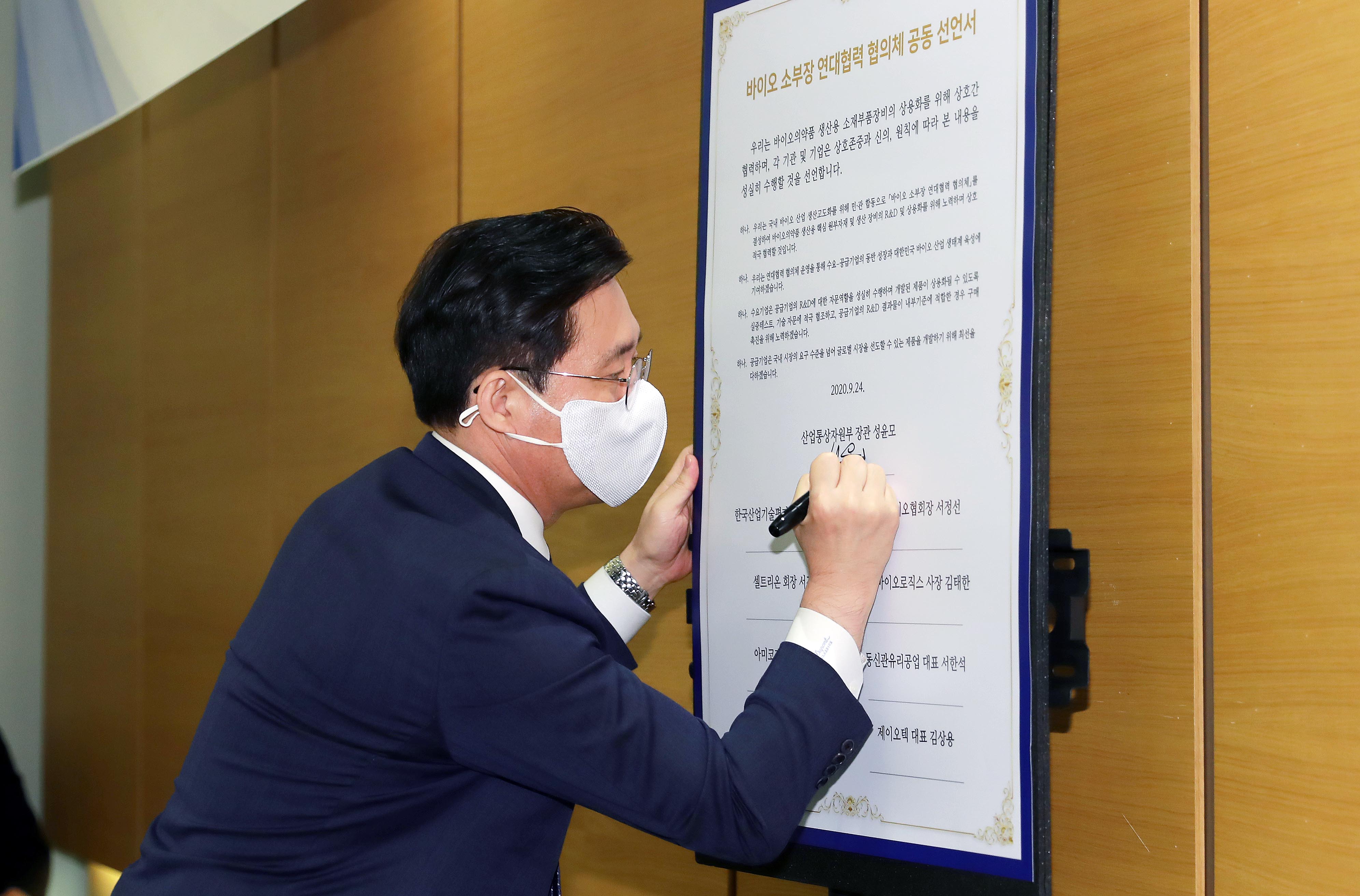 Trade, Industry and Energy Minister Sung Yun-mo attended a launching ceremony for the Cooperation Council for Biohealth Materials, Parts, and Equipment Sectors, in Yeouido, Seoul, on September 24, to strengthen competitiveness of the biohealth industry and facilitate adequate policy support. The Ministry plans to spend 85.7 billion won (USD 73 million) over the next five years for the development of biohealth products, and encourage cooperation between supply and demand companies to inc date2020-09-28