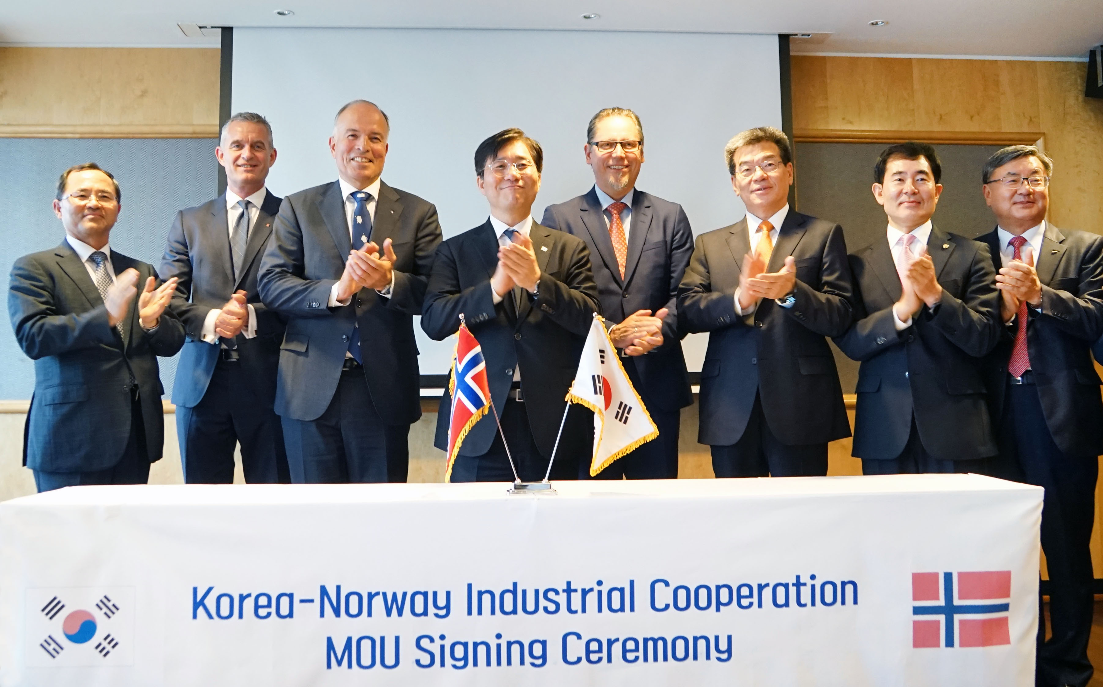 Trade, Industry and Energy Minister Sung Yun-mo (fourth from the left) attended a memorandum of understanding (MOU) signing ceremony for industrial cooperation between Korea and Norway held in Oslo on June 12 (local time).On the occasion of President Moon Jae-in’s state visit to Norway, a total of four MOUs on shipbuilding and robotics were signed and two Korean ship construction technologies were approved between Seoul and Oslo’s industries.With the MOUs, concerted efforts will be m date2019-06-13