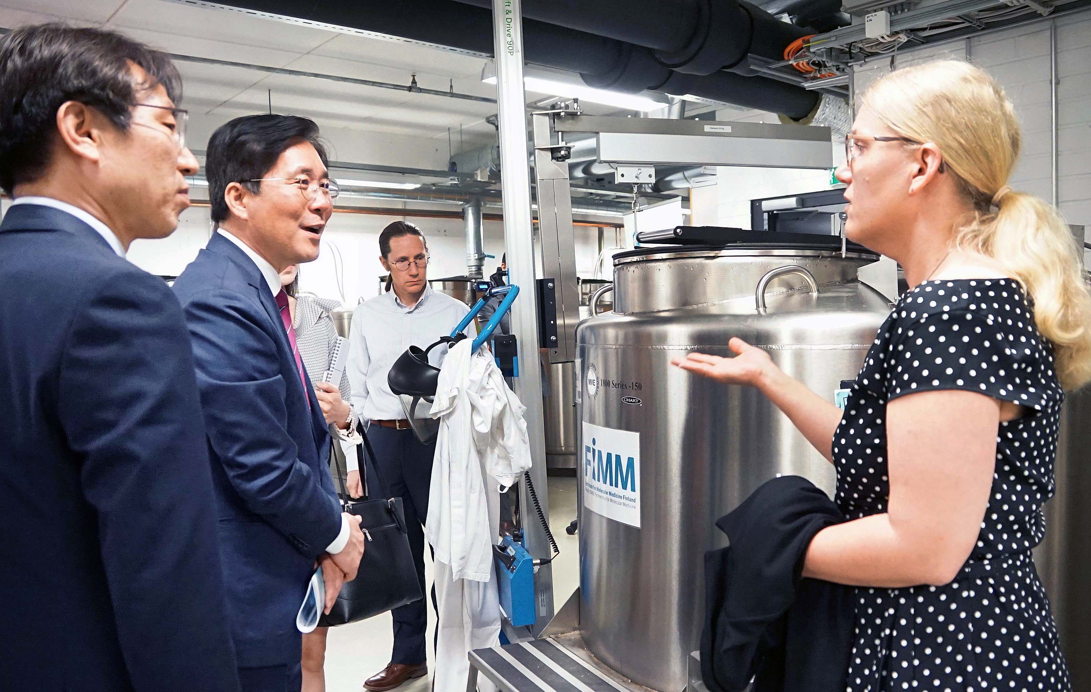 Trade, Industry and Energy Minister Sung Yun-mo (second from the left) and Science and Technology Advisor to the President Lee Kong-joo toured the Institute for Molecular Medicine Finland (FIMM) located in Helsinki on June 11 (local time) on the occasion of President Moon Jae-in’s state visit to Finland.At the research center, the top officials were briefed by FIMM’s Director Mark Daly and Research Director Johan Lundin on FinnGen, a large scale genome study, as well as digital diagn date2019-06-12