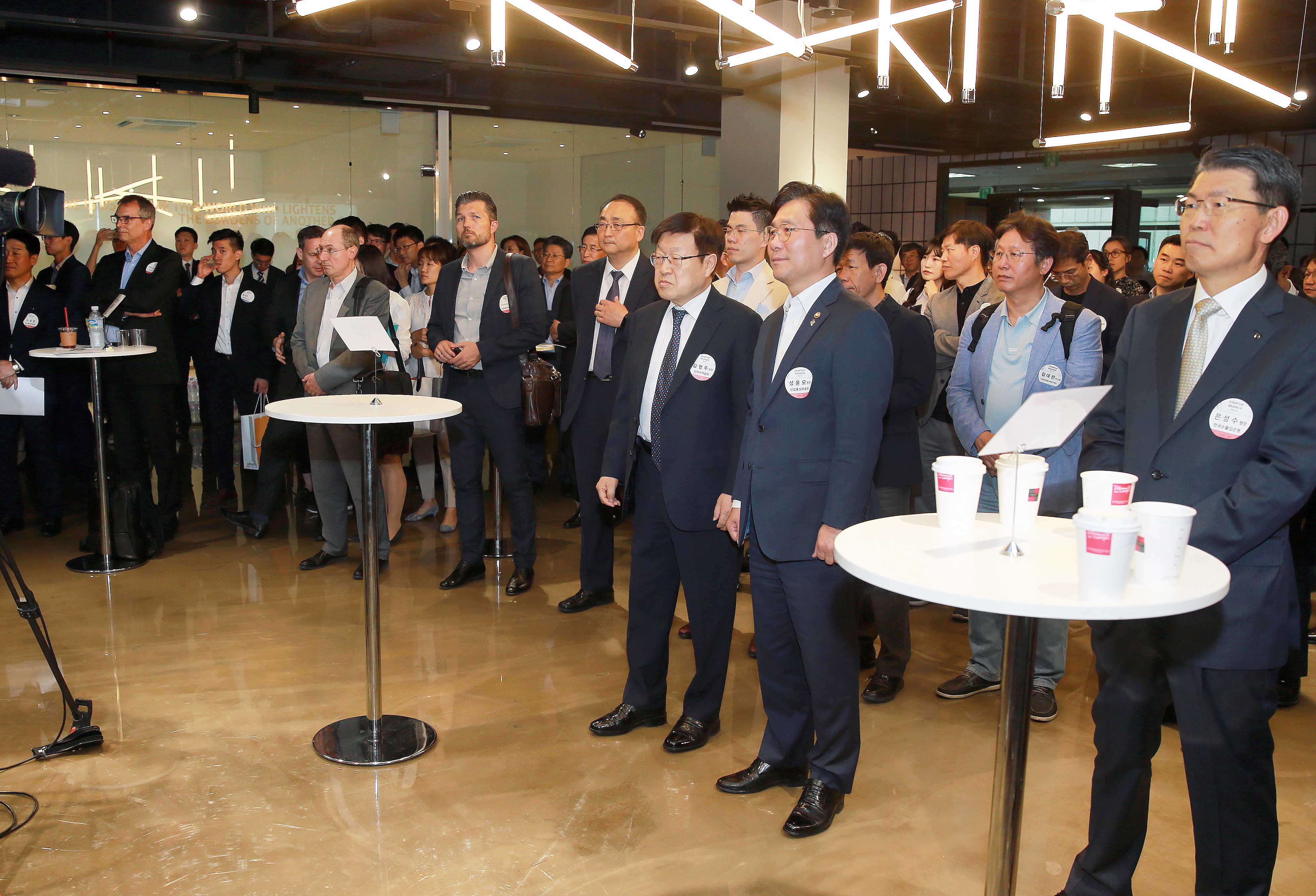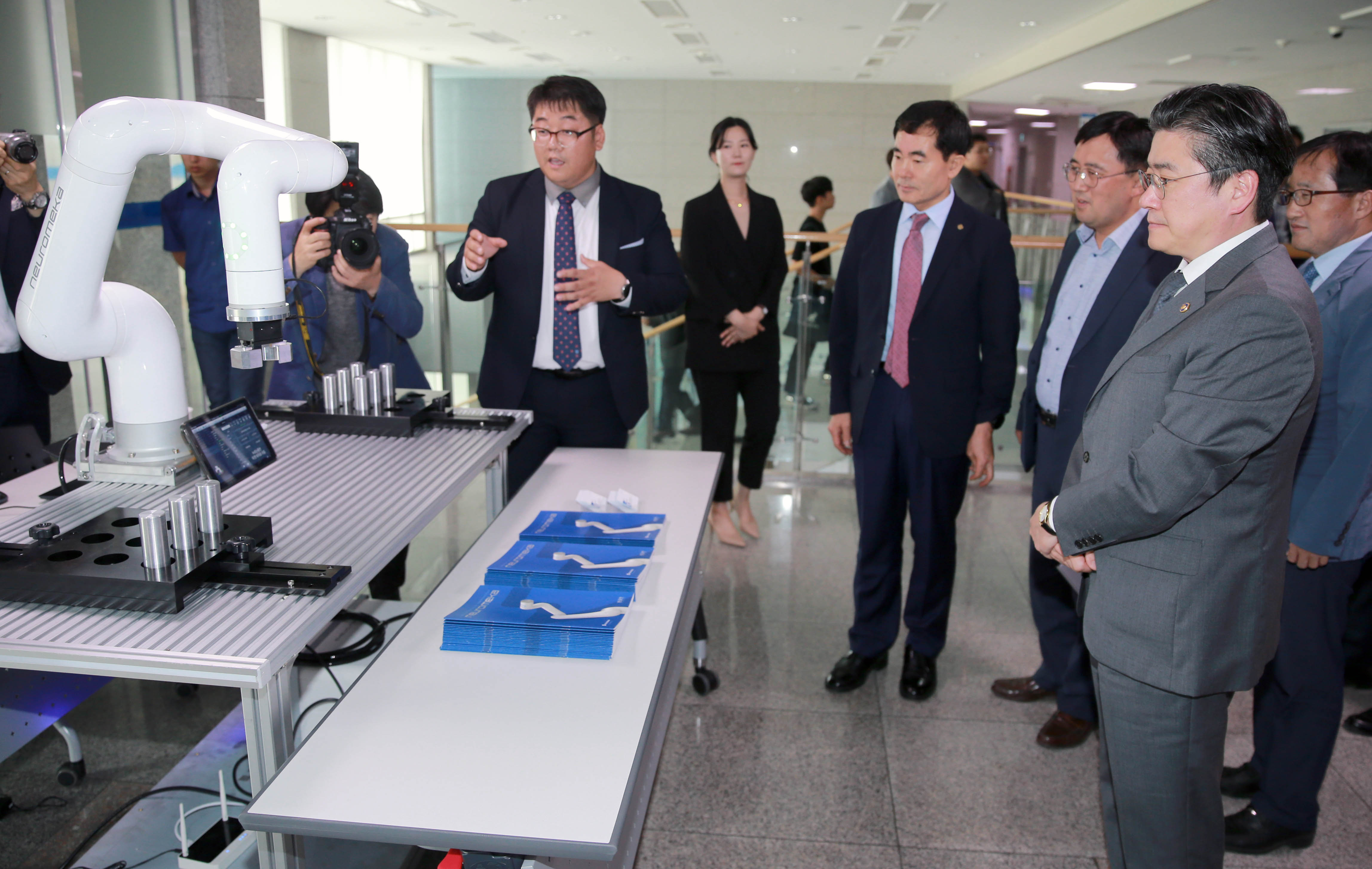 Trade, Industry and Energy Vice Minister Cheong Seung-il (right) made opening remarks at a presentation seminar held to promote the use of robots in the manufacturing industry in Siheung, southwest of Seoul, on May 30.At the seminar, potential robot users were introduced to the process and effectiveness of robot implementation from companies with the best practices of robot usage. Robot makers were also present to introduce their products and explain their applications. At the same time, researc date2019-05-30