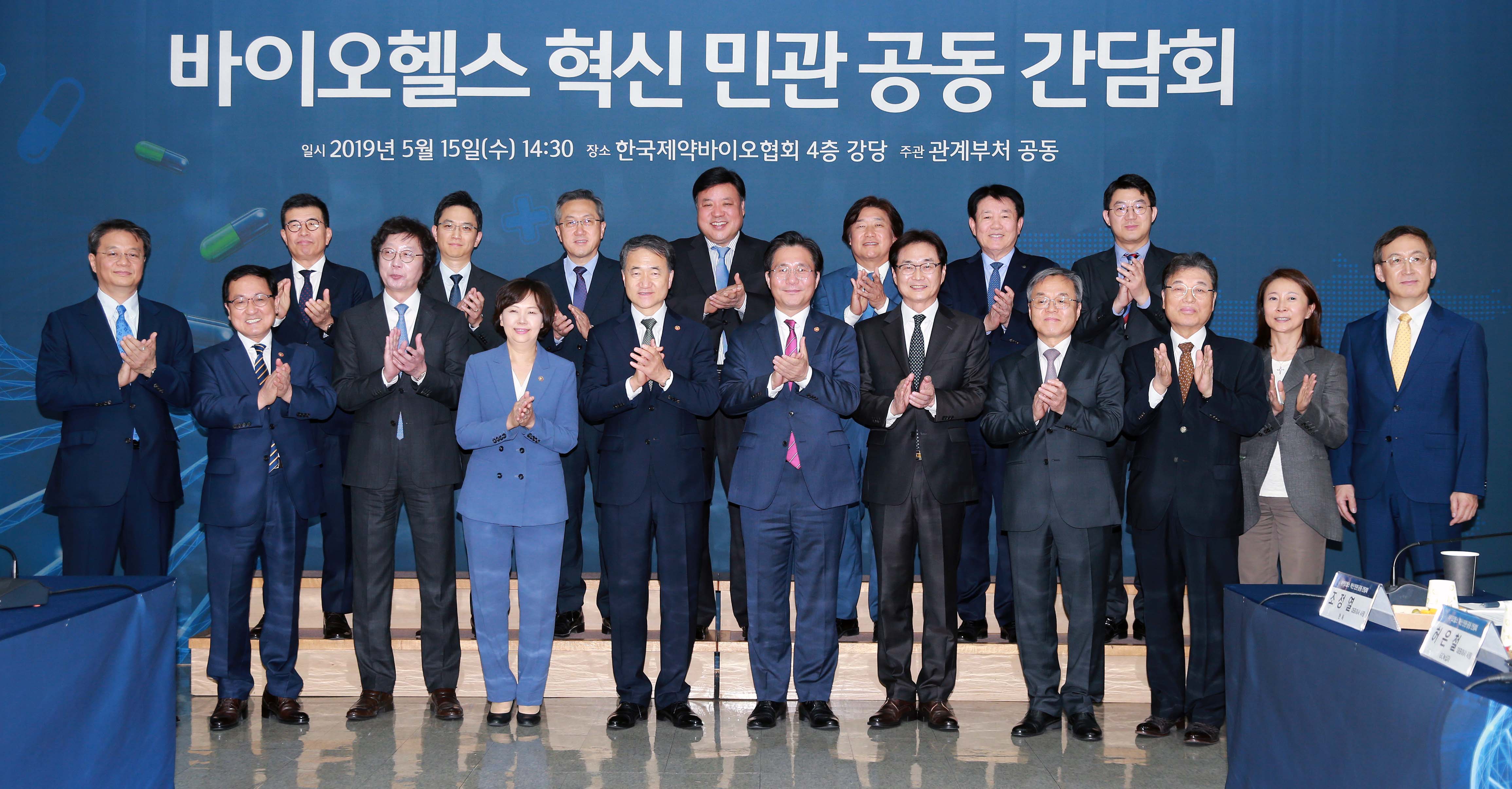 Trade, Industry and Energy Minister Sung Yun-mo (center in the front row) – together with Science and ICT Minister You Young-min, Health and Welfare Minister Park Neung-hoo, Food and Drug Safety Minister Lee Eui-kyung, and Economy and Finance Deputy Minister Bang Ki-sun – joined a public-private discussion for innovation in the bio-health industry in Seoul on May 15.At the meeting, the Ministers and Korean bio-health businesses explored a range of topics including securing technologi date2019-05-15