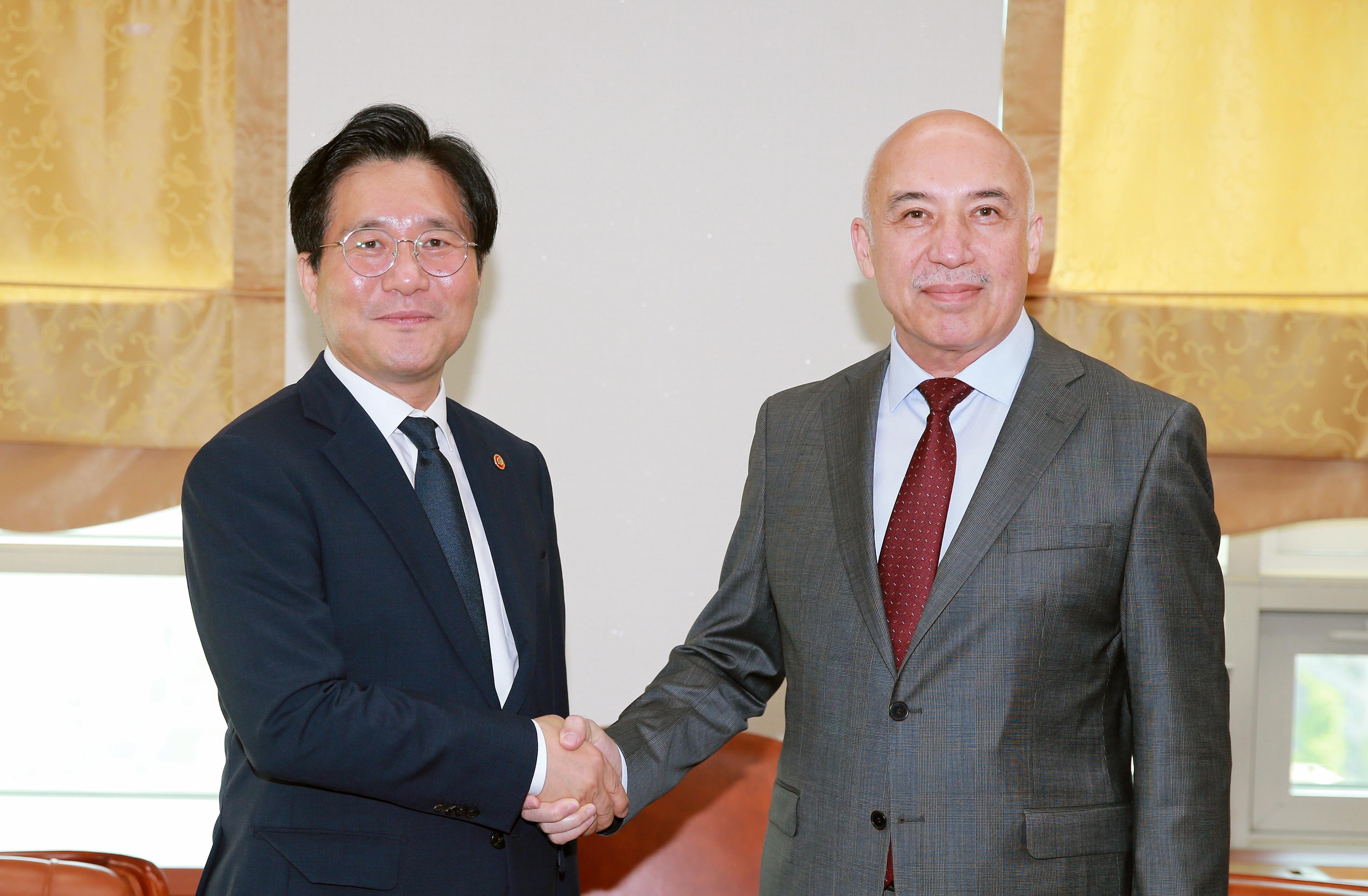 Trade, Industry and Energy Minister Sung Yun-mo (left) had a meeting with Uzbekistan’s Public Health Minister Shadmanov Alisher Kayumovich in the Government Complex Seoul on May 14.The two Ministers discussed bilateral cooperation in bio-health and digital healthcare as well as subsequent efforts following the presidential summit that took place in April. date2019-05-14
