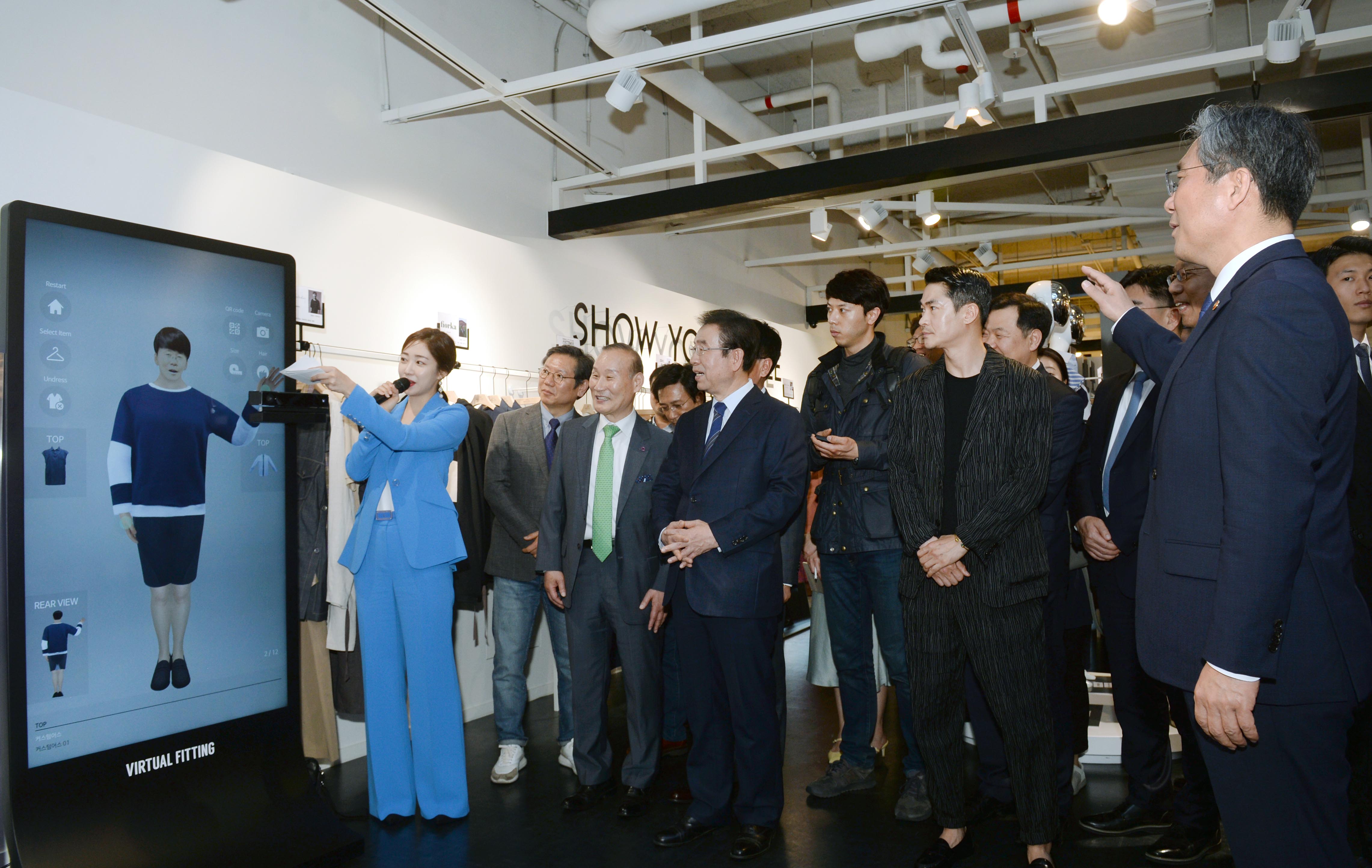 Trade, Industry and Energy Minister Sung Yun-mo (right) and Seoul City Mayor Park Won-soon (center) attended the opening ceremony of a new state-of-the-art clothing shop in Dongdaemun District, Seoul, on April 25.The clothing store is capable of designing and producing customized clothes within 24 hours. This was possible because of the Dongdaemun area’s advanced fashion infrastructure and Korea’s competitive information and communications technology (ICT).During his speech at the ev date2019-04-25