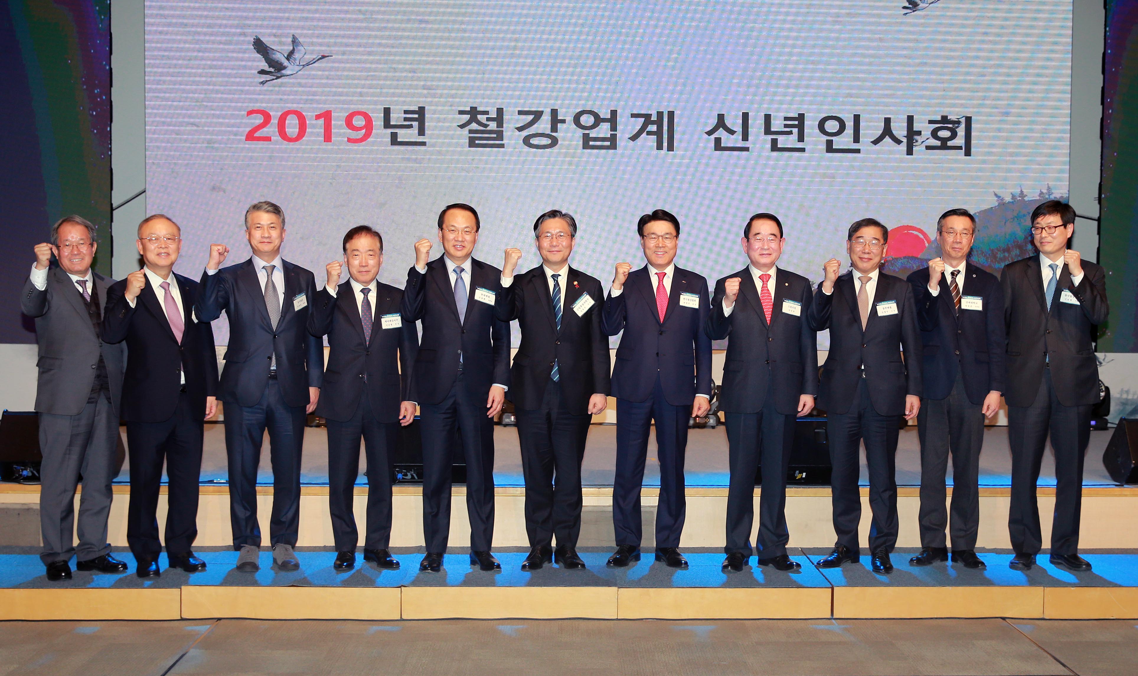 Trade, Industry and Energy Minister Sung Yun-mo (center) met with steel industry leaders to share the Korean government’s 2019 policy directions at a new year’s gathering in Seoul on January 10.During his congratulatory remarks at the meeting, Minister Sung praised their efforts in achieving steel exports of $600 billion last year amid rising global protectionism and other uncertainties.To overcome the challenges posed by internal and external factors this year, Minister Sung asked f date2019-01-10