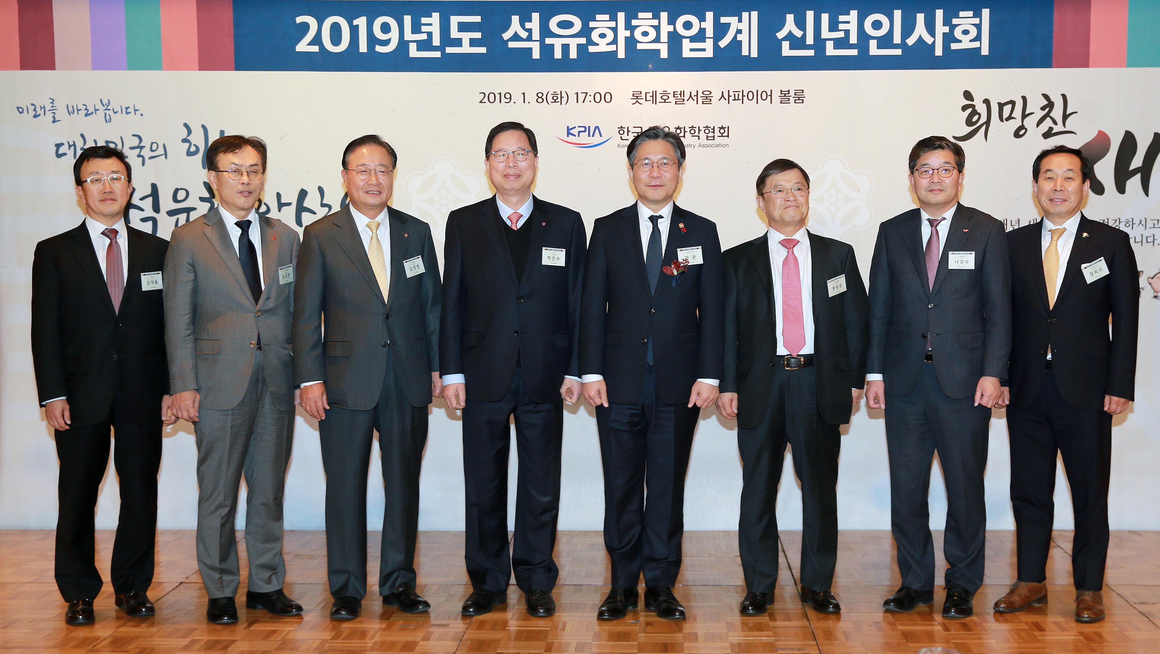 Trade, Industry and Energy Minister Sung Yunmo (fourth from the right) shared the Korean government’s policy directions for 2019 with petrochemical industry leaders at a new year’s meeting in Seoul on January 8.During his congratulatory remarks, Minister Sung said that the Korean petrochemical exports that surpassed the $50 billion mark last year made a great contribution to the country’s economic growth. He attributed this achievement to active investment activities and increa date2019-01-08