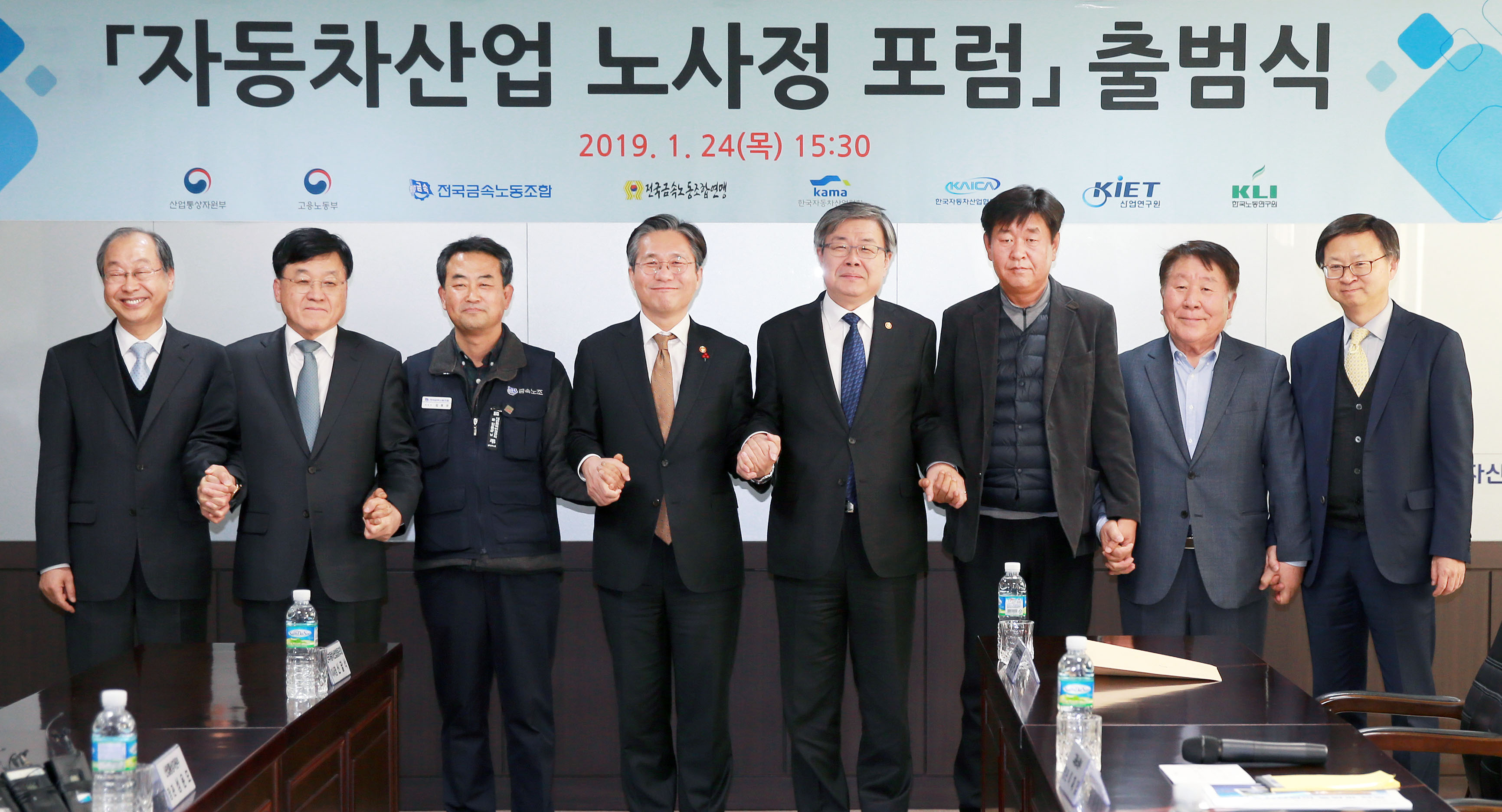Trade, Industry and Energy Minister Sung Yun-mo (fourth from the left), together with Employment and Labor Minister Lee Jae-kap (fourth from the right), attended the inauguration ceremony of the labor-management-government forum for the Korean auto industry that was held in Seoul on January 24.During the meeting, Minister Sung said that the establishment of this tripartite forum will allow future-oriented discussions to take place between the participants based on mutual trust, providing opportu date2019-01-24