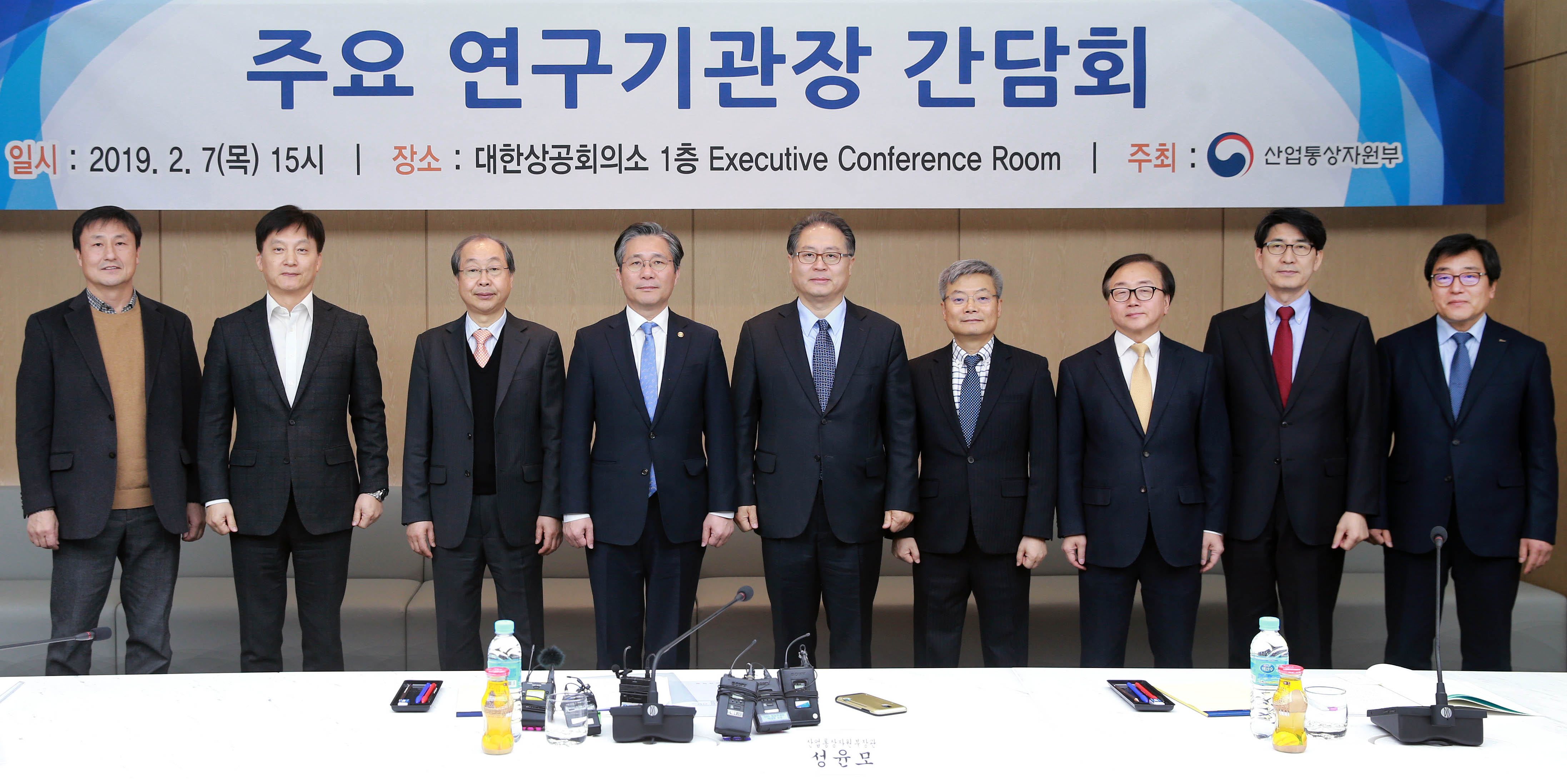 Trade, Industry and Energy Minister Sung Yun-mo (fourth from the left) discussed industrial revitalization and innovation at a meeting with Korean think tank leaders that took place at the Korea Chamber of Commerce and Industry (KCCI) in Seoul on February 7.At the meeting, Minister Sung mentioned that while recent difficult export conditions largely resulted from the impact of external factors such as the U.S.-China trade dispute, a global economic slowdown, and falling oil prices, now is the ti date2019-02-07