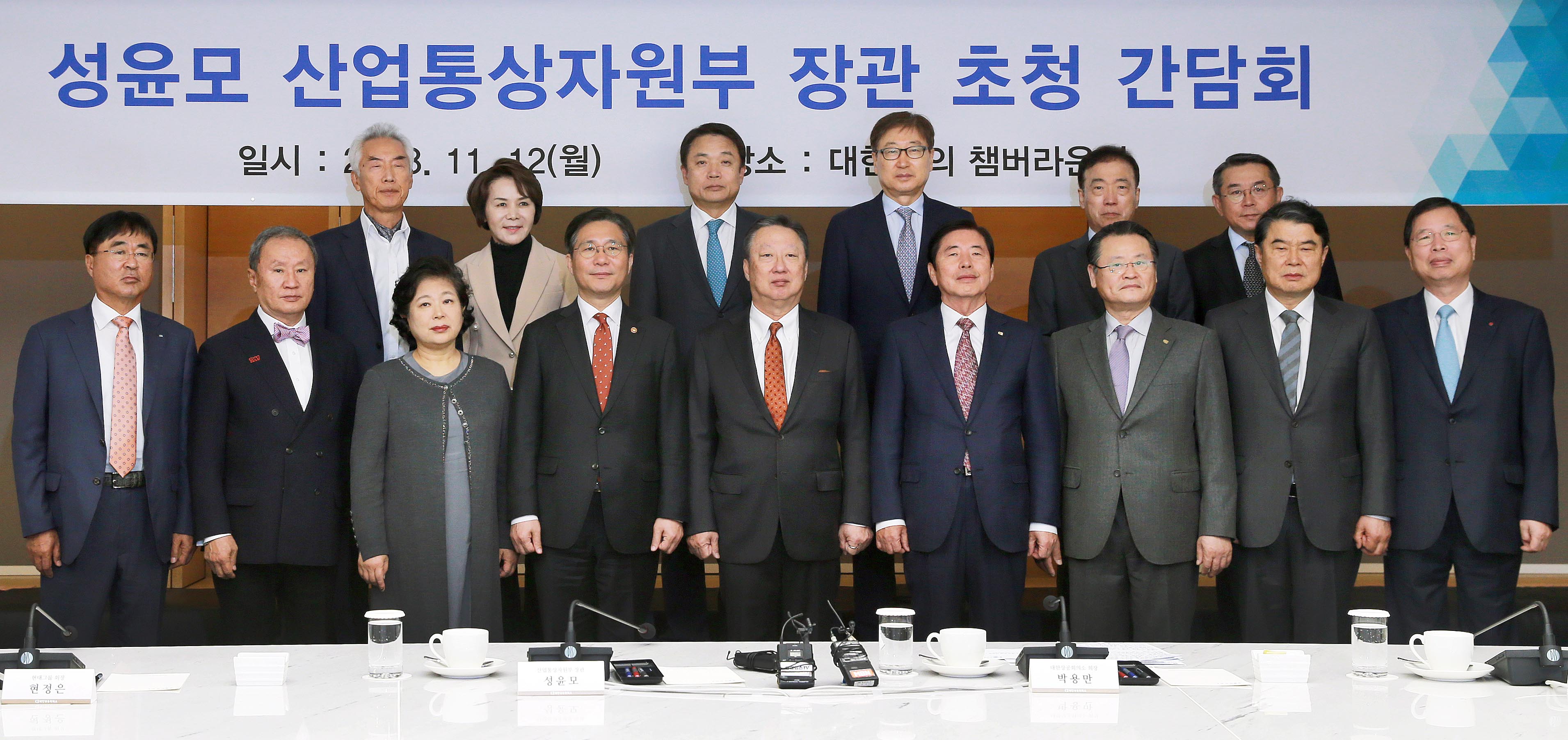 Trade, Industry and Energy Minister Sung Yunmo (fourth from left in the front row) had a discussion with business leaders of the Korea Chamber of Commerce and Industry (KCCI) at the KCCI building in Seoul on November 12.The meeting was held to listen to the opinions of the industry representatives and to enhance cooperation between the public and private sectors.Among the attendees were KCCI Chairman Park Yongmaan, Tong Yang Moolsan Corp. Chairman Kim Hui Yong, and LG Chem Vice Chairman Park Jin date2018-11-12