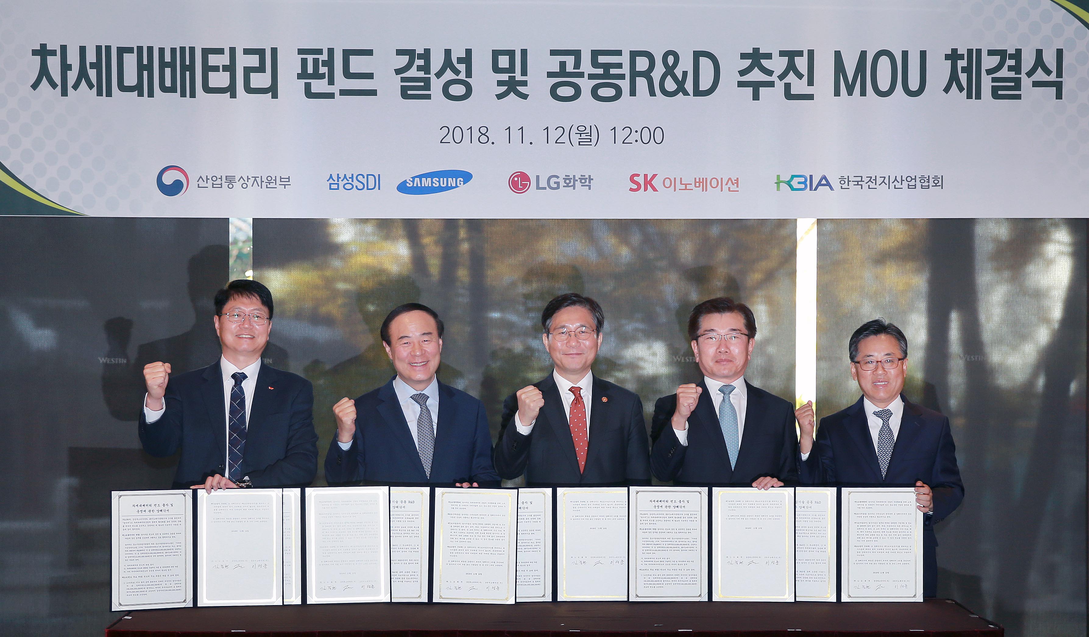 Trade, Industry and Energy Minister Sung Yunmo (center) attended the memorandum of understanding (MOU) signing ceremony between Korea’s battery manufacturers that was held in Seoul on November 12.After the MOUs were signed between the three battery makers to create a fund and collaborate on research and development, Minister Sung said in his speech that the Korean government will actively support technology innovation and investment in the battery sector.The event was attended by about 10 date2018-11-12