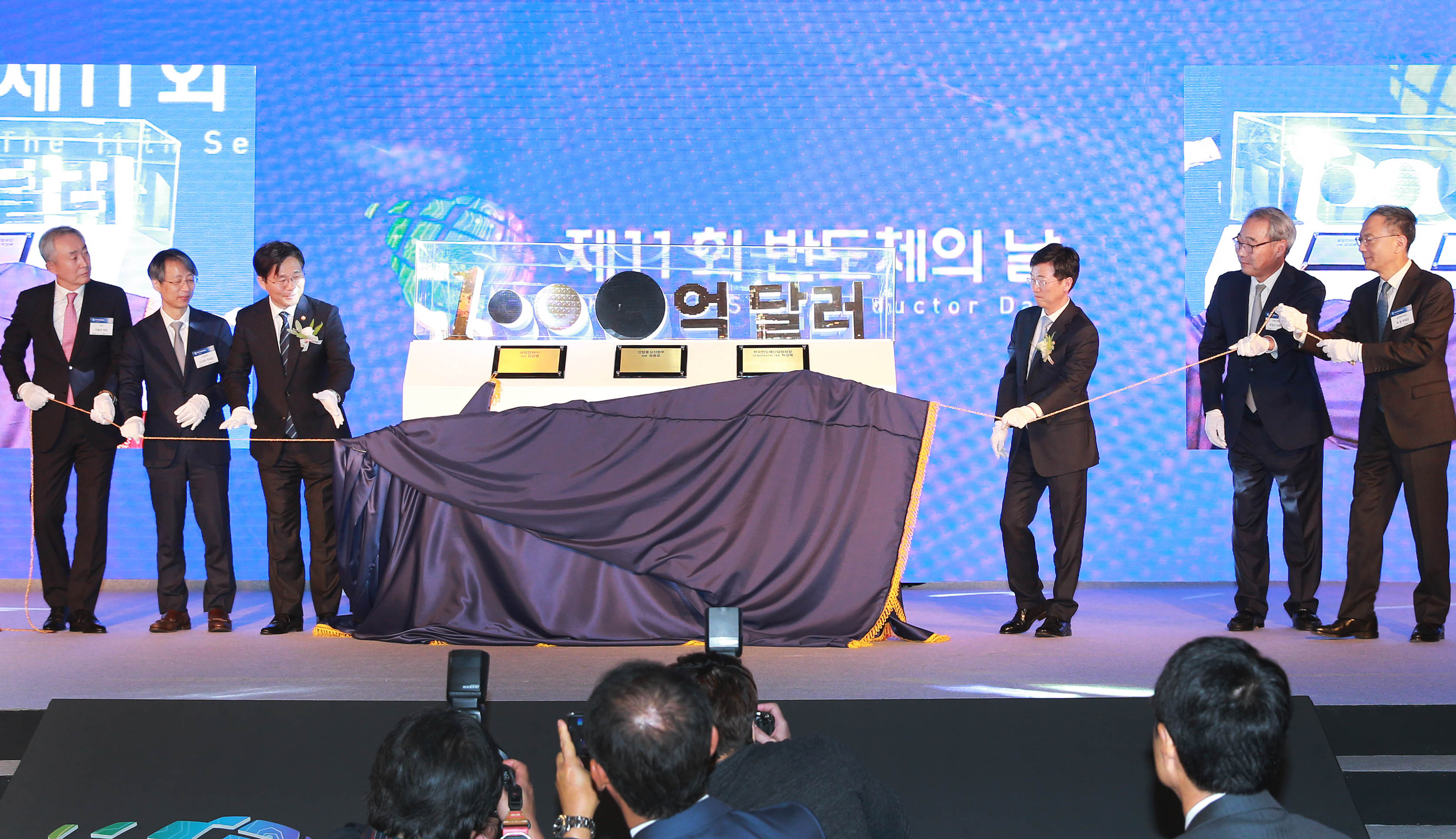 Trade, Industry and Energy Minister Sung Yunmo (third from the left) lauded Korea’s unprecedented achievement of surpassing annual chip exports of $100 billion at the ceremony of the 11th Annual Semiconductor Day that took place at COEX in Seoul on October 25.During his commemorative address at the event, Minister Sung said that this accomplishment was possible because of close public-private cooperation, as well as homegrown companies that made bold endeavors, continuous investments, and date2018-10-25