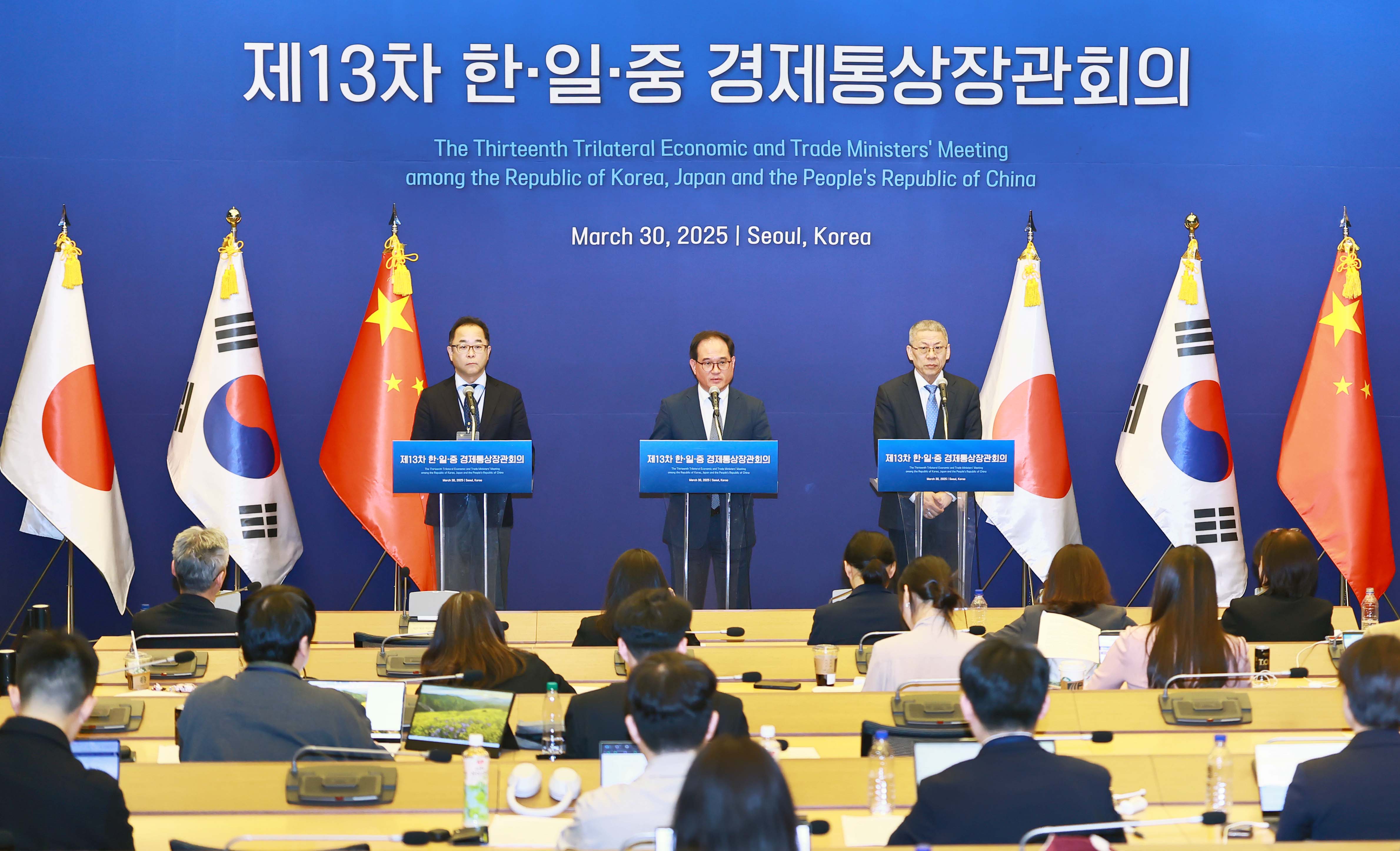The Ministry of Trade, Industry and Energy (MOTIE) of Korea, the Ministry of Economy, Trade, and Industry (METI) of Japan, and the Ministry of Commerce (MOFCOM) of China held a joint press briefing on the sidelines of the 13th Korea-Japan-China Economic and Trade Ministers’ Meeting on March 30 in Seoul. date2025-03-31