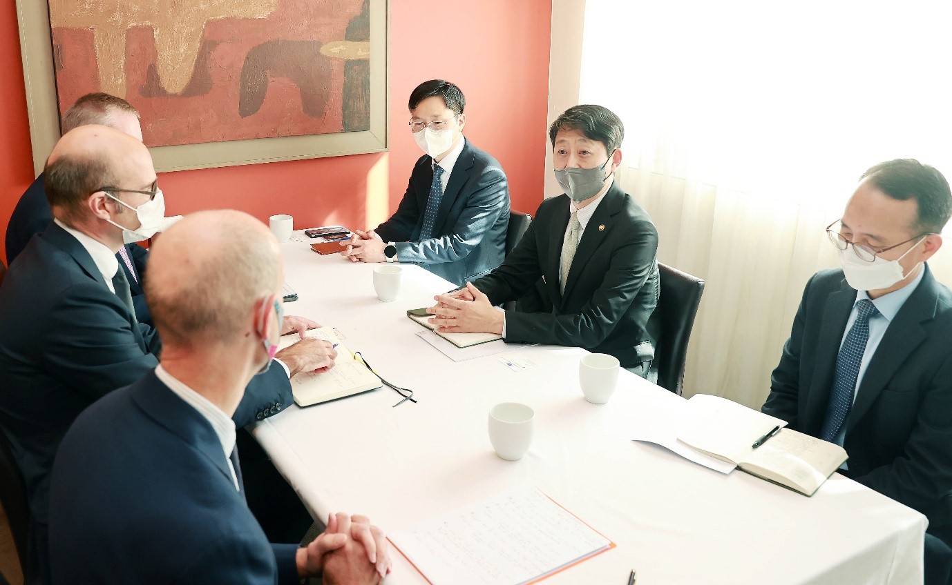 Trade Minister Ahn Duk-geun met with British Ambassador to the Republic of Korea Colin Crooks, Swedish Ambassador to the Republic of Korea Daniel Wolven, Ambassador of the Federal Republic of Germany to the Republic of Korea Michael Reiffenstuel, and Christophe Bess, Charge' d'affaires of the European Union on October 19 in Seoul to discuss response measures to the U.S.’ Inflation Reduction Act (IRA). date2022-10-21