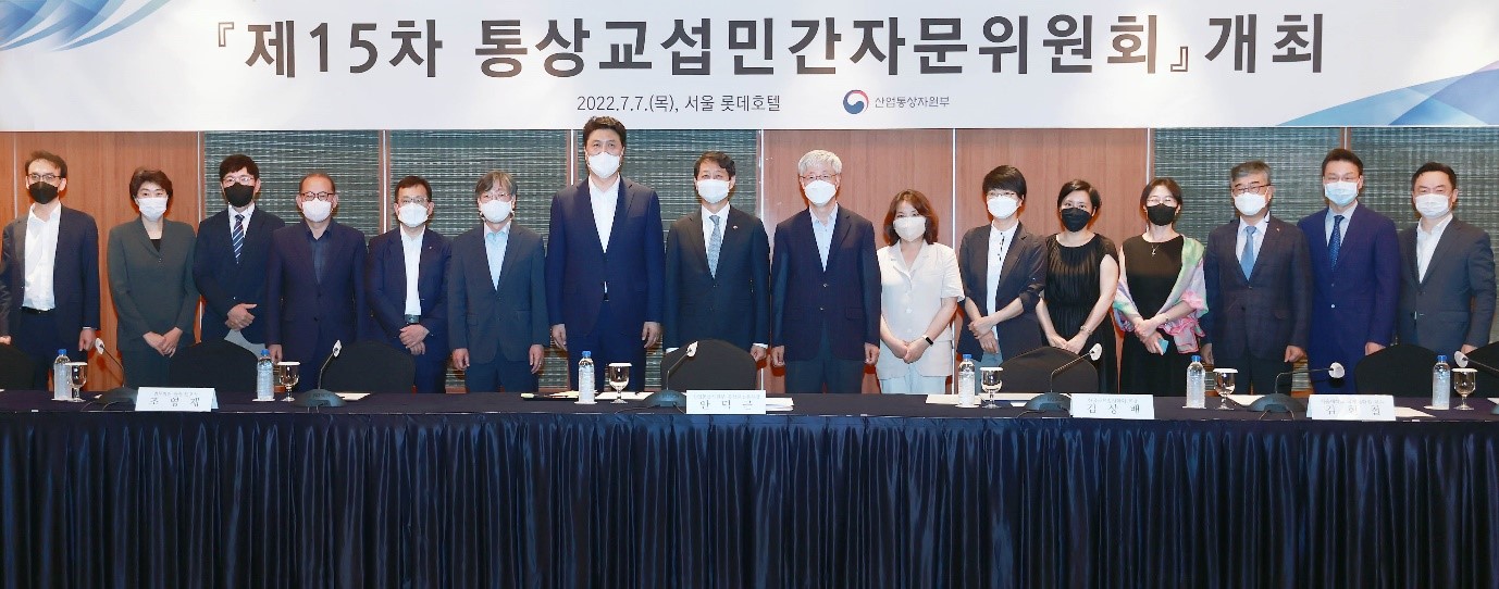 Trade Minister Ahn Duk-geun held the 15th Trade Advisory Committee (hereinafter “Committee”) Meeting at the Lotte Hotel Seoul on July 7, the first meeting of its kind under South Korea's new regime. The above Committee is a consultation body focused on communication with corporations and consists of approximately 30 experts from industries and academia, serving as one of the main public-private collaborative channels. This meeting was held to discuss matters related to trade policy date2022-07-11