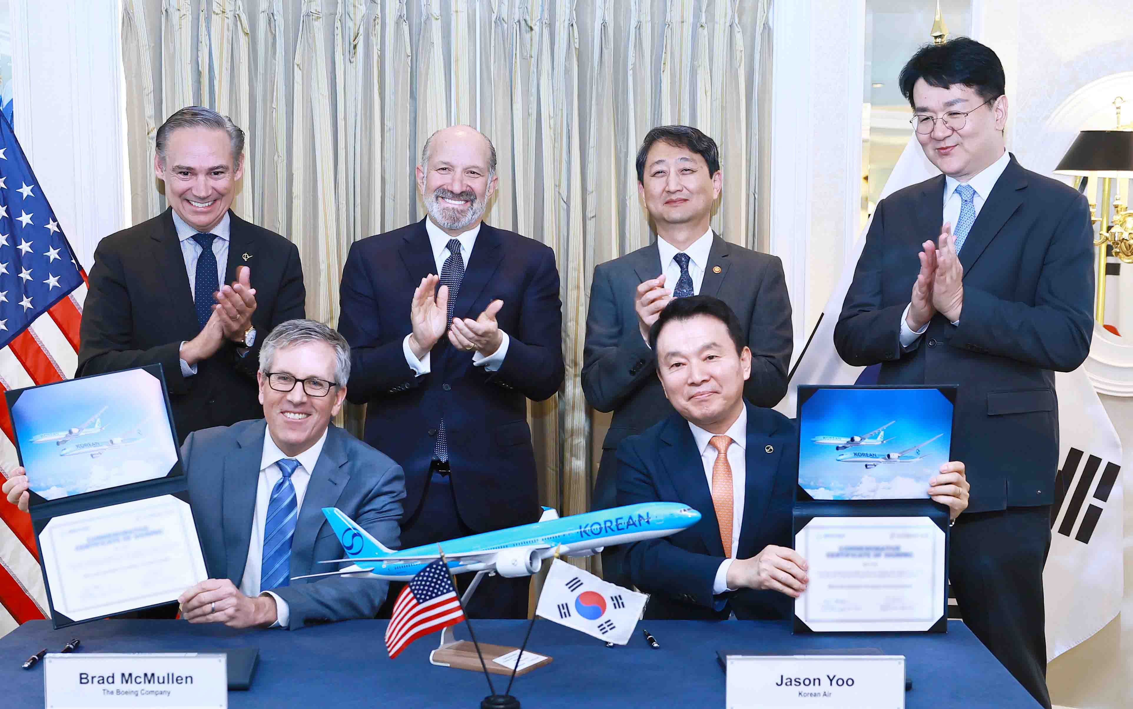 On the occasion of Minister of Trade, Industry and Energy Dukgeun Ahn of the Republic of Korea’s visit to Washington D.C. from March 20-21 (local time), Mr. Ahn and U.S. Secretary of Commerce Howard Lutnick jointly attended a signing ceremony with Korean Air, Boeing & GE to strengthen their strategic partnerships. * Corporate Attendees: Walter Cho (Chairman & CEO of Korean Air and Hanjin Group), Kelly Ortberg (President & CEO of Boeing), Russel Stokes (President & CEO of GE Aerospace) The signing ceremony underscores Korean Air’s commitment to collaboration with Boeing and GE Aerospace prior to the finalization of large-scale contracts with a total value of 32.7 billion USD. In particular, this event marks the first joint participation of Ministers from Korea and the United States under President Trump’s second administration, raising expectations for further cooperation between the two countries in various areas including aviation, semiconductors, shipbuilding and energy. * Details of the contract between Korean Air-Boeing: The two companies will soon finalize a firm order for twenty Boeing 777-9 and twenty Boeing 787-10 by 2033, and options for an additional ten aircraft (worth a total 24.9 billion USD). ** Details of the contract between Korean Air-GE: The two companies will soon finalize a firm order for eight spare engines (plus options for two additional engines) and engine maintenance services (worth a total 7.8 billion USD). Minister Ahn stated in his congratulatory remarks that “through these collaborations with prominent U.S. aviation companies, Korean Air is set to further strengthen its position in the global aviation market, accelerating its journey to becoming one the world’s top ten airlines.” Minister Ahn also emphasized that these agreements will pave the way for further strengthening the wide-ranging material and human exchanges between Korea and the United States, vowing that the Korean government “will continue to actively support cooperation in the private sector between both countries.” date2025-03-21